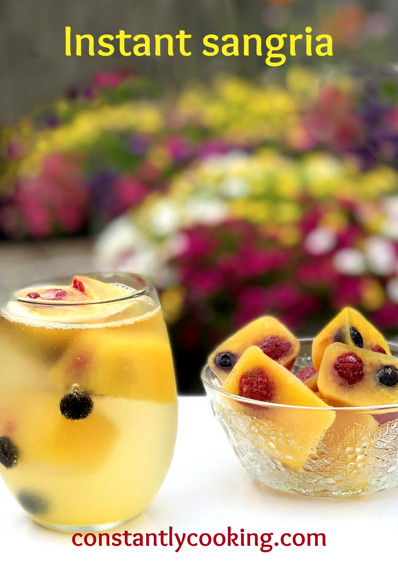 - To assemble one drink, put four sangria cubes in a glass. Add wine then top with soda water or ginger ale. Let sit for a few minutes so cubes begin to melt; stir and enjoy.