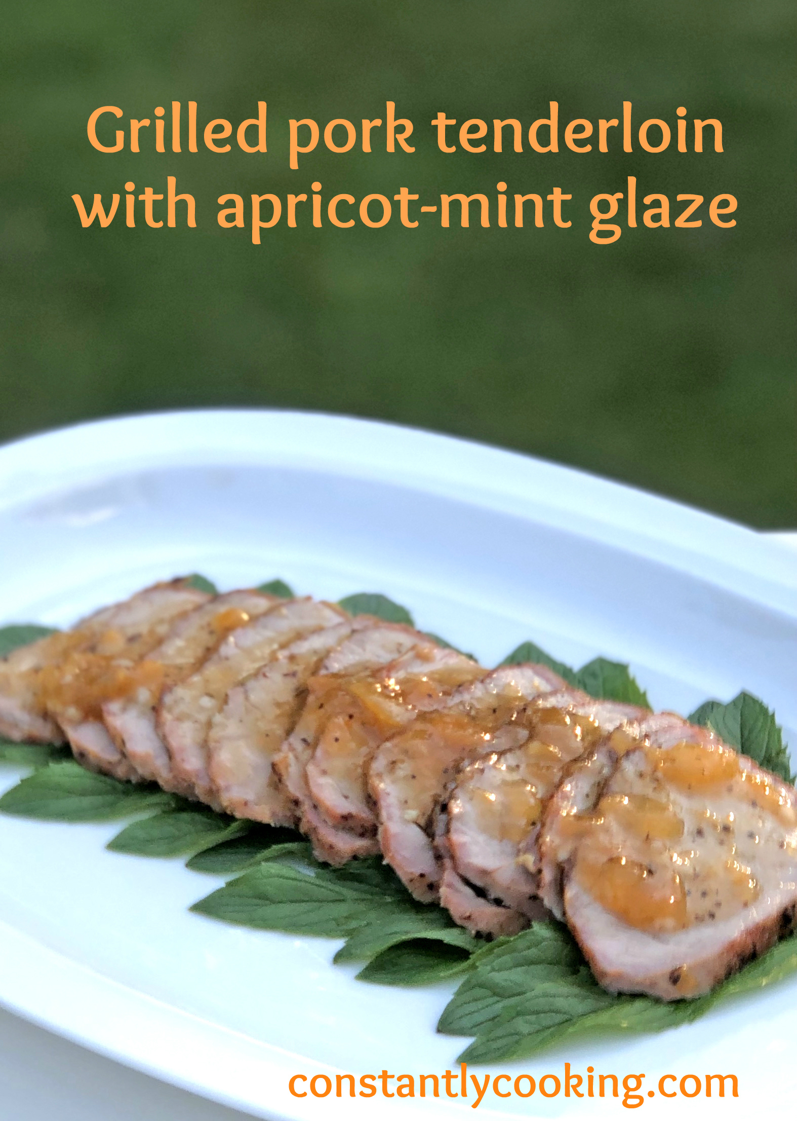 • Remove pork from grill and place on a clean plate. Cover loosely with foil and let sit for 3 – 5 minutes. Slice thinly, then arrange slices on a platter lined with mint leaves. Spoon reserved glaze evenly over top and serve warm.
