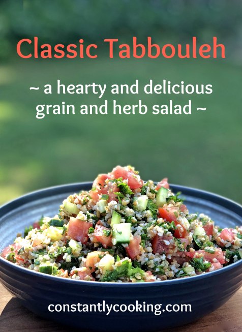 Tabbouleh (sometimes spelled Tabouli) is a delicious dish that hails from various Middle Eastern countries. Its name is derived from an Arabic word meaning seasoning or spice, which is appropriate given how packed with flavour this salad is. It is typically prepared with bulgar (also known as cracked wheat) but you could also make it with freekeh, couscous or even quinoa for a gluten-free version. While some North American Lebanese restaurants use less bulgar (or omit it entirely), I like to include it to make the salad as hearty and nutritious as possible. I like to make Tabbouleh at least an hour before serving (preferably longer) so the herbs can infuse the grains and vegetables. While it’s best served chilled, this is a great salad for picnics or other outdoor gatherings because it is dairy-free so safe at room or even warmer temperatures. You can serve this on its own, with pita bread, or as a side dish for this fabulous shawarma-style chicken and potatoes.
