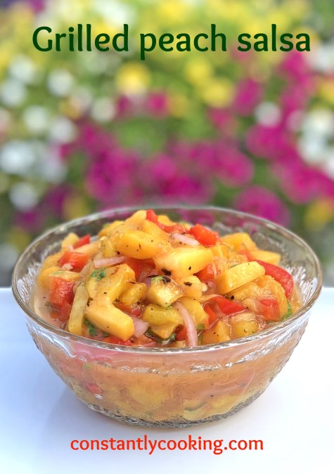 I love fruit salsas (this strawberry version and this cherry salsa are two of my favourites) and find that grilling the key components before making the salsa adds a ton of flavour. If you prefer, you can also grill the peaches and red pepper under a hot broiler or scorch them in a cast iron pan. Naturally, this salsa is fabulous with a big basket of tortilla chips, but I also love serving it with grilled chicken, pork and fish. If you like the flavour of grilled peaches you might also enjoy my grilled peach Bellini or my grilled peaches with chèvre and dukkah.