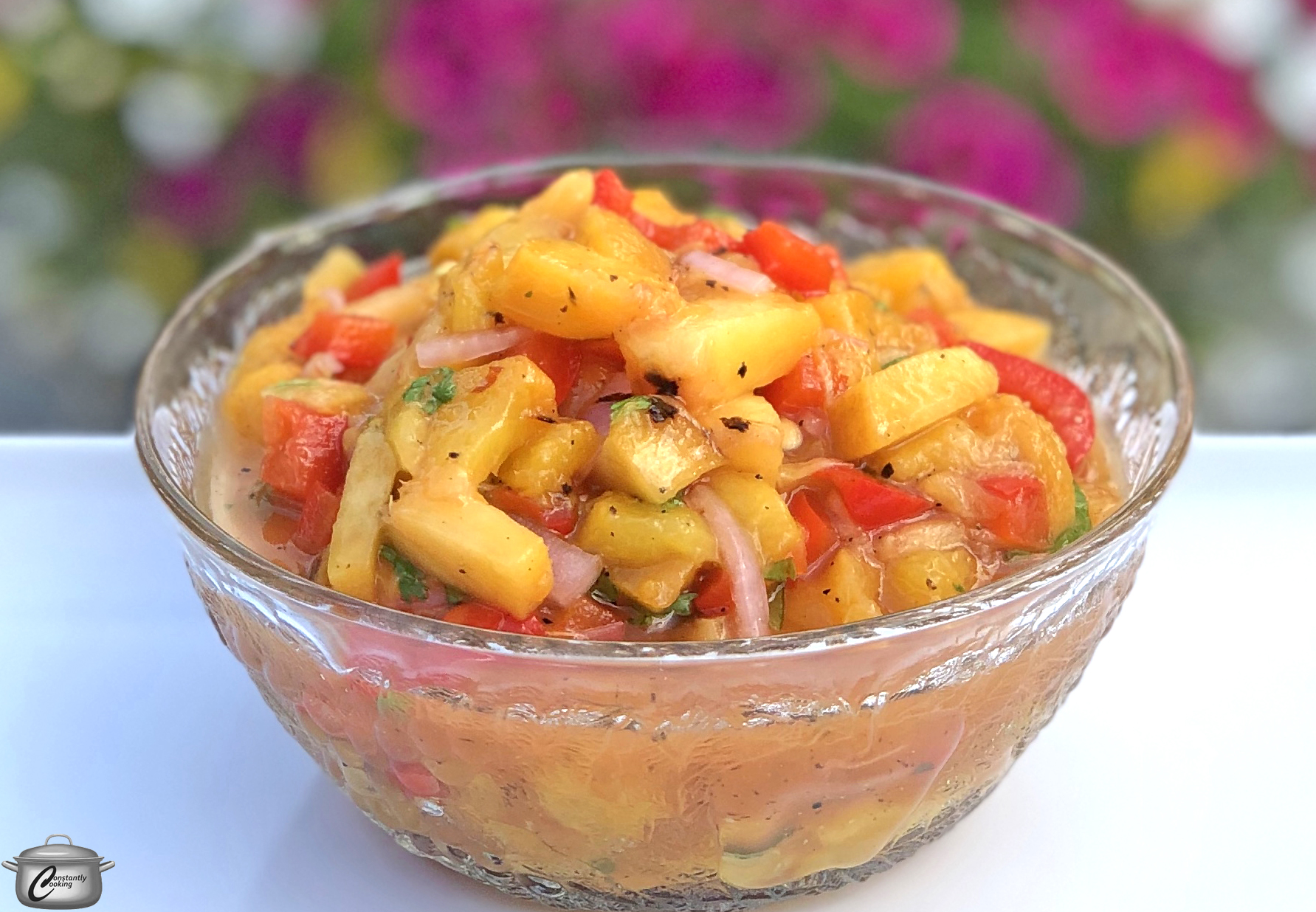 • Once cooked, finely chop the grilled peaches and peppers and place them in a medium-sized bowl.