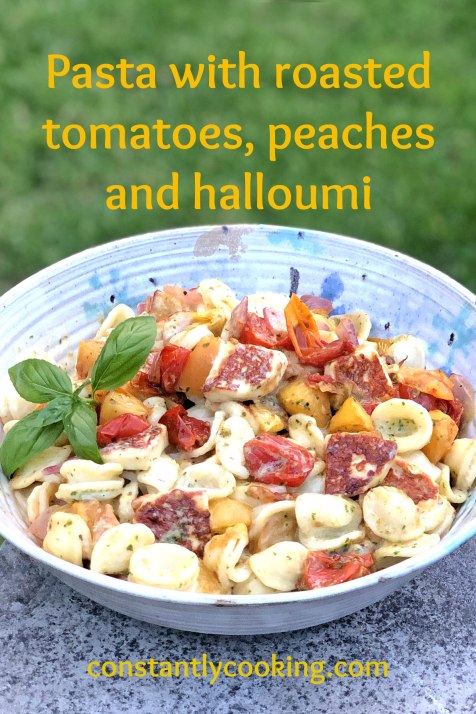 This is a colourful, nutritious and – most importantly – scrumptious meal that is super easy to prepare. If you’re not familiar with halloumi you are in for a big treat with this wonderful source of protein. Halloumi is a firm, brined cheese that originated in Cyprus; it has a high melting point so it is great for frying or grilling. This dish is also a really flexible one – if you like, you can roast other vegetables such as mushrooms, peppers and zucchini in addition to the tomatoes, peaches and onions. If you’re fortunate enough to have leftovers, this meal is just as tasty the next day.