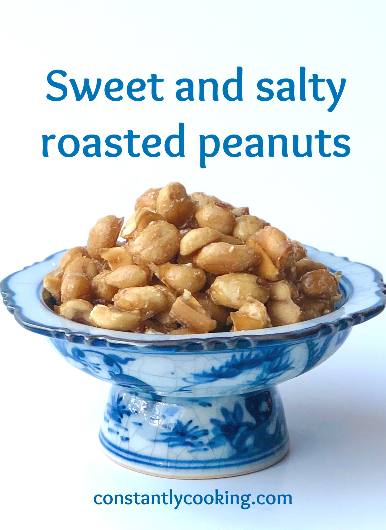 In this year of ‘not travelling’, I’m drawing a lot of inspiration from previous trips, fondly remembering delicious food discoveries made across Canada and around the world. Candied peanuts were both a delight and a bit of a salvation when served to my hangry husband and me in a little café in Paris, after a long day of exhilarating but exhausting sightseeing. I find my ‘make at home version’ to be tasty on their own but even more delightful with a glass of one’s favourite beverage in hand. They’re also super when used to top curries, Pad Thai and other savoury dishes. This same recipe/technique can easily be used with other firm nuts such as cashews or almonds.