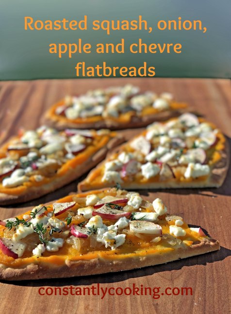 This recipe is basically a deconstructed version of one of my very favourite soups – roasted butternut squash with apple. I love the taste of roasted squash and was quite certain it would be ideal on a flatbread, garnished with just a few other ingredients to add flavour, colour and texture. You can use commercially prepared flatbreads or make your own with pizza dough; just be sure they are baked before you add the toppings. You can cook the squash and caramelize the onions ahead of time, to speed up the assembly process later. To make it even faster, swap in 2/3 cup (160 mL) canned pumpkin purée (not pumpkin pie filling) for the squash. The quantities below reflect what’s needed to top the equivalent of one 10 inch (25 cm) round flatbread. This dish would make an ideal appetizer for a Thanksgiving or Christmas-time meal. If you like creative flatbreads, you might want to try this fully-loaded mashed potato flatbread or this taco version.