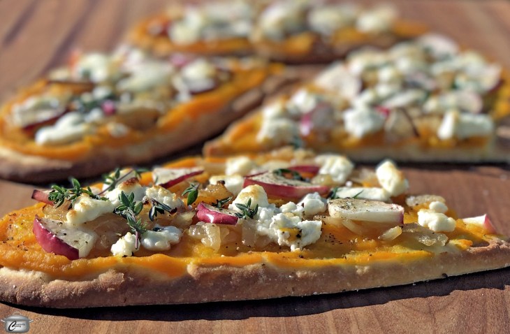 - When ready to assemble, place the flatbread(s) on a parchment-lined baking tray. Spread 2/3 cup (160 mL) of the squash purée over the flatbreads in a thin, even layer. Sprinkle the caramelized onions on next, then scatter the apple slices and crumbled chèvre over top, followed by a little salt and pepper.