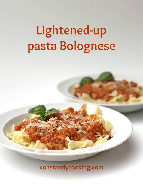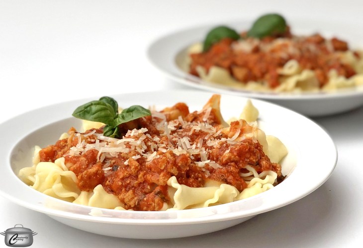 Don’t get me wrong – I love a decadent, rich pasta Bolognese. Simmered for hours, the beefy sauce is decadent and delightful. But sometimes, it can just feel a little too heavy for my palate. I decided to play around with ground poultry and see if I could come up with a sauce that had the same creamy texture without the heaviness, and which could be prepared in under an hour. A traditional Bolognese starts with the standard Italian soffritto base (sautéed onion, celery and carrot) plus minced beef and sometimes fatty pork like pancetta (bacon), red or white wine and heavy cream. As you can see below, in place of the pancetta, I’ve opted to use bacon fat for a little flavour boost but you can certainly use olive oil instead; reducing the amount of cream and increasing the amount of hot pasta cooking water added at the end gives the sauce the appropriate and appealing texture. Note that Bolognese is meant to be served over wide, flat pasta such as tagliatelle so the sauce sits on top of the noodles; you can also use pappardelle, fettuccine, rigatoni or penne. This is an ideal recipe for make-ahead cooking; you can make a double or triple batch and freeze in family-sized containers; just be sure to add the hot pasta cooking water right before serving.