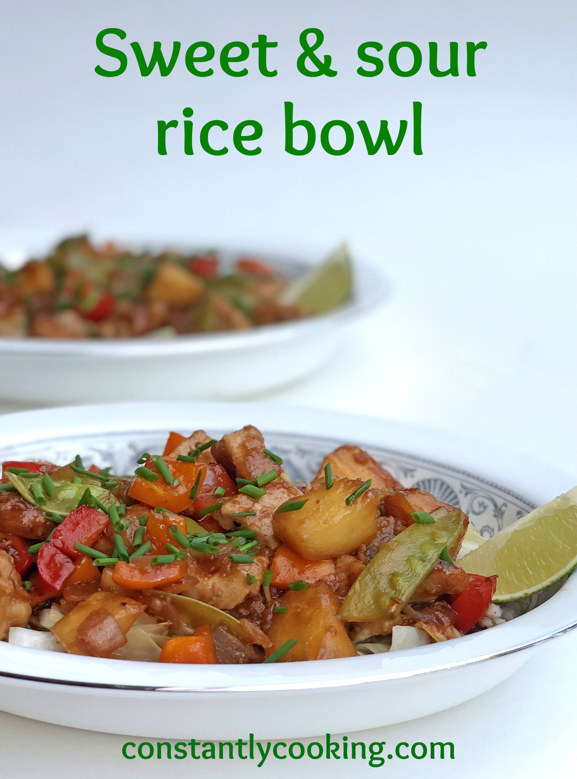 - To assemble, take two broad, shallow bowls and put half of the cooked brown rice in the bottom of each one. Put the cabbage (raw or cooked) into the bowls as the next layer. Top with the sweet and sour pork/tofu and peppers, dividing the sauce equally between the bowls. Garnish with chopped green onion and a big lime wedge to squeeze over the dish.