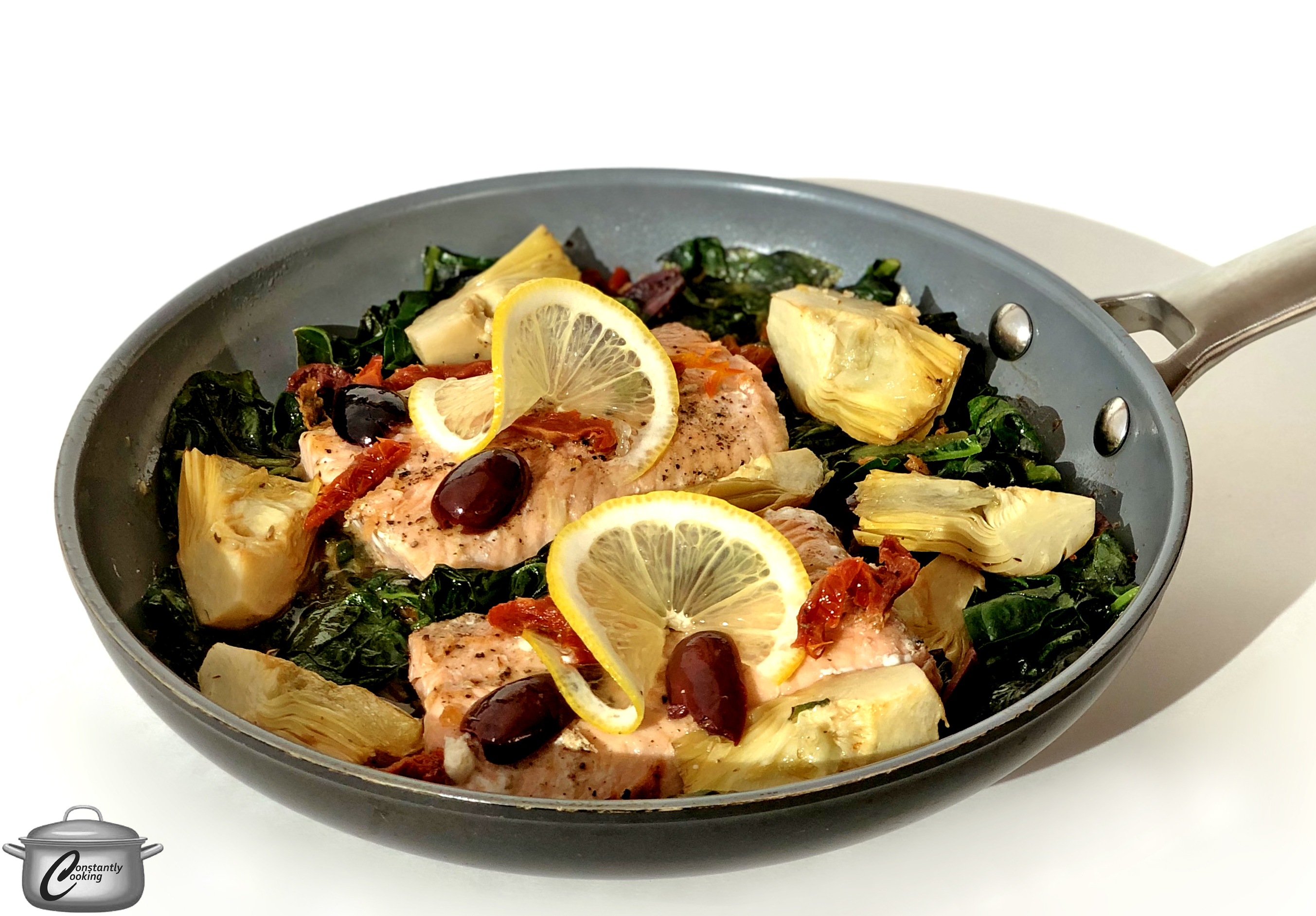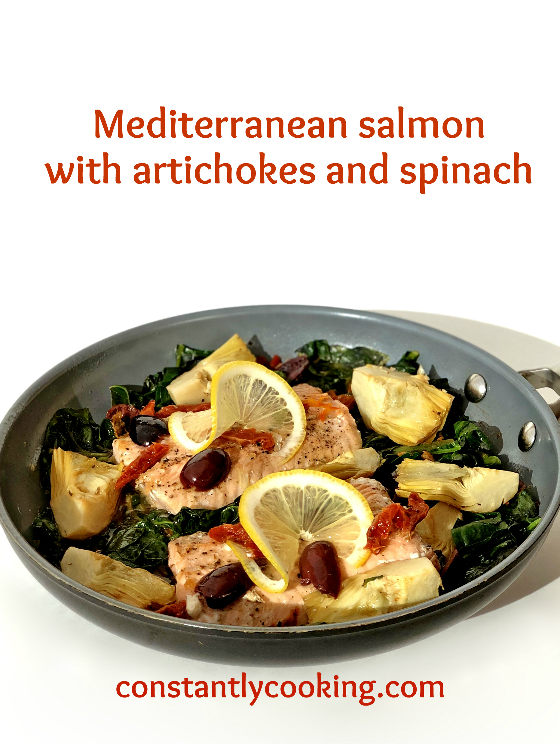 This delicious dish is yet another one that can turn reluctant fish eaters into fish lovers, just like my fish with stuffing and vegetables. Mild-flavoured salmon readily absorbs all the delicious add-ins that make this meal so tasty; note that you can use fresh or frozen fillets, with or without the skin on (and it is MUCH easier to remove the skin after you have seared the salmon). Whole pickled artichoke hearts in brine, available at specialty food stores, are ideal (cut into quarters); if you can’t find them, the jarred ones cut into eighths are fine as well. You can eat this dish as-is, or serve it over cooked pasta (I like orzo for this), rice or mashed potatoes. If you do choose to add a base layer of your favourite starch, I recommend doubling the wine and lemon juice to create more sauce.
