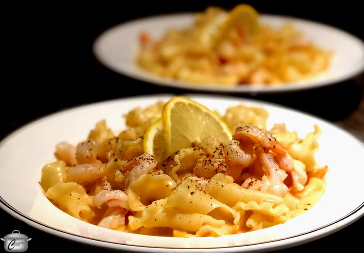 - When pasta is cooked, scoop out 1/3 cup (90 mL) of the starchy pasta cooking water then drain the noodles. Add drained pasta (along with the cooked lemon slices) to the shrimp mixture along with the reserved pasta cooking water. Stir to coat pasta with sauce. Remove from heat; squeeze remaining lemon over top. Serve immediately, sprinkled with freshly ground black pepper.