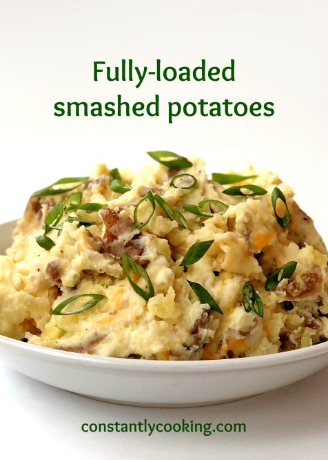 My family loves baked potatoes now, but when my kids were little they were not fans. They found it a struggle to split them open so they could load them up with tasty toppings, plus they often wouldn’t eat the skins which was vexing to me as I adore potato skins. This recipe was my solution – it incorporates all the great add-ins that make baked potatoes so scrumptious, but it’s made casserole-style. For this dish, the potatoes are mashed more coarsely, to resemble the texture of baked potatoes. I like to use red potatoes for the colour contrast and nutrition the skins add but you can use whatever potatoes you like, and peel them if you prefer. Note that you can prepare this dish up to 72 hours before serving and refrigerate it until you’re ready to reheat and serve. If you really want to go all-out, crumbled cooked bacon bits can be added as an extra garnish.