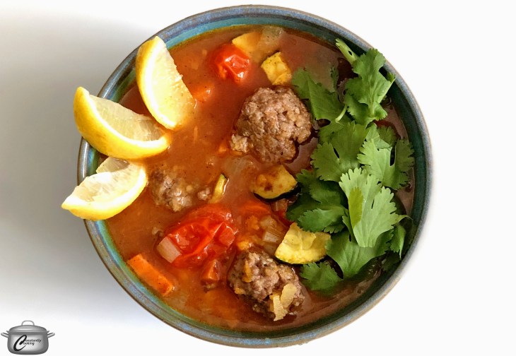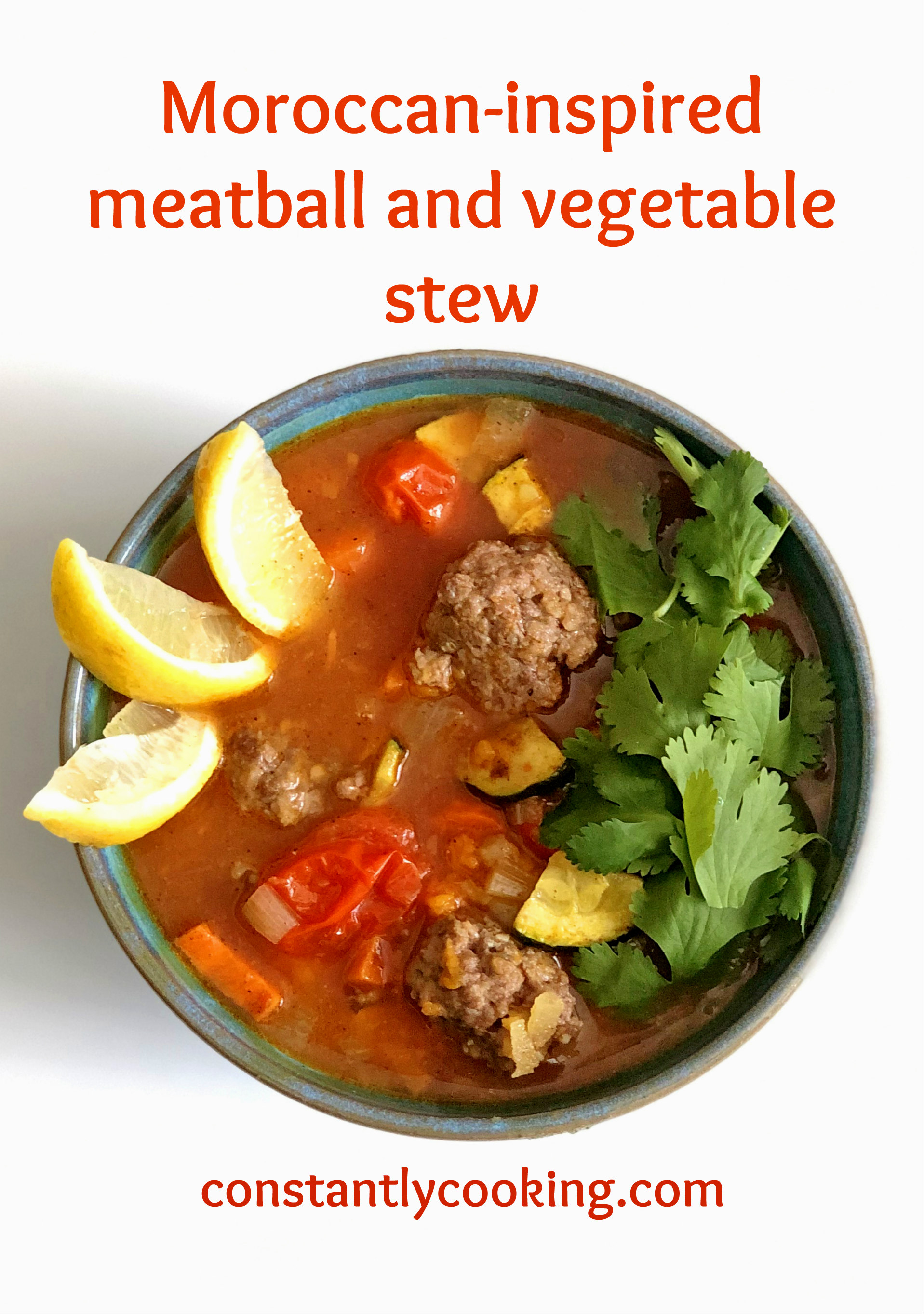 This hearty and aromatic dish has quickly become a favourite comfort food meal for my family. The technique of layering the seasoning throughout all components of the stew makes it extra flavourful and appealing. Once you prep the meatballs and chop the vegetables, the soup is a cinch to pull together and the whole process takes just over half an hour. Any leftover soup freezes well. Note that it’s easy to make a vegetarian or vegan version of this soup my making the meatballs with your favourite plant-based protein. If you’re looking for more ways to love meatballs, I highly recommend this Thai meatball and rice noodle bowl.