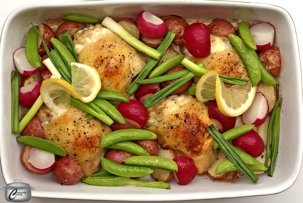 - Place the radishes, spring onions and snap peas in the bowl you used to toss the potatoes and garlic. Drizzle with a little olive oil then add to the pan. Roast for another 20 – 25 minutes until chicken thighs register 165F at their thickest point and potatoes are golden brown and tender.