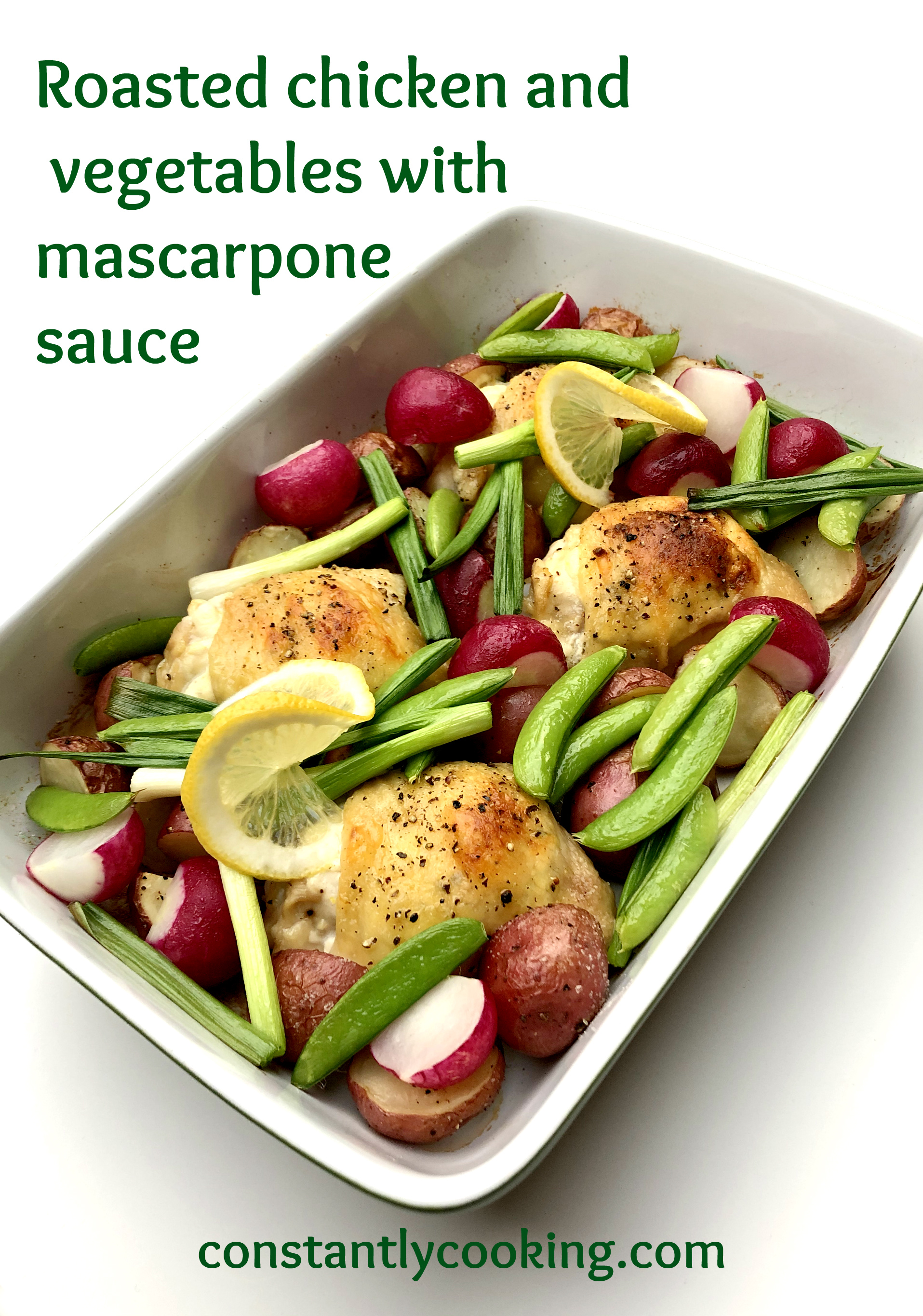 - Once chicken is cooked, remove from pan. Drizzle the mascarpone and stock mixture around the vegetables. Return the chicken to the pan then place pan back in the oven for 5 – 7 minutes to heat the sauce, stirring once or twice.