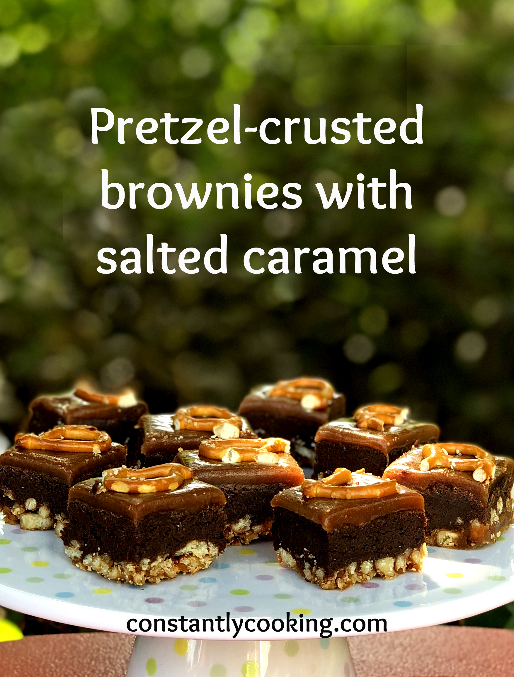 - Pour the caramel over the baked brownies and spread out if needed to make an even layer. Let sit at room temperature for one hour, then gently press pretzel pieces into the caramel to decorate the top (or sprinkle with a bit of flaky sea salt), if desired.