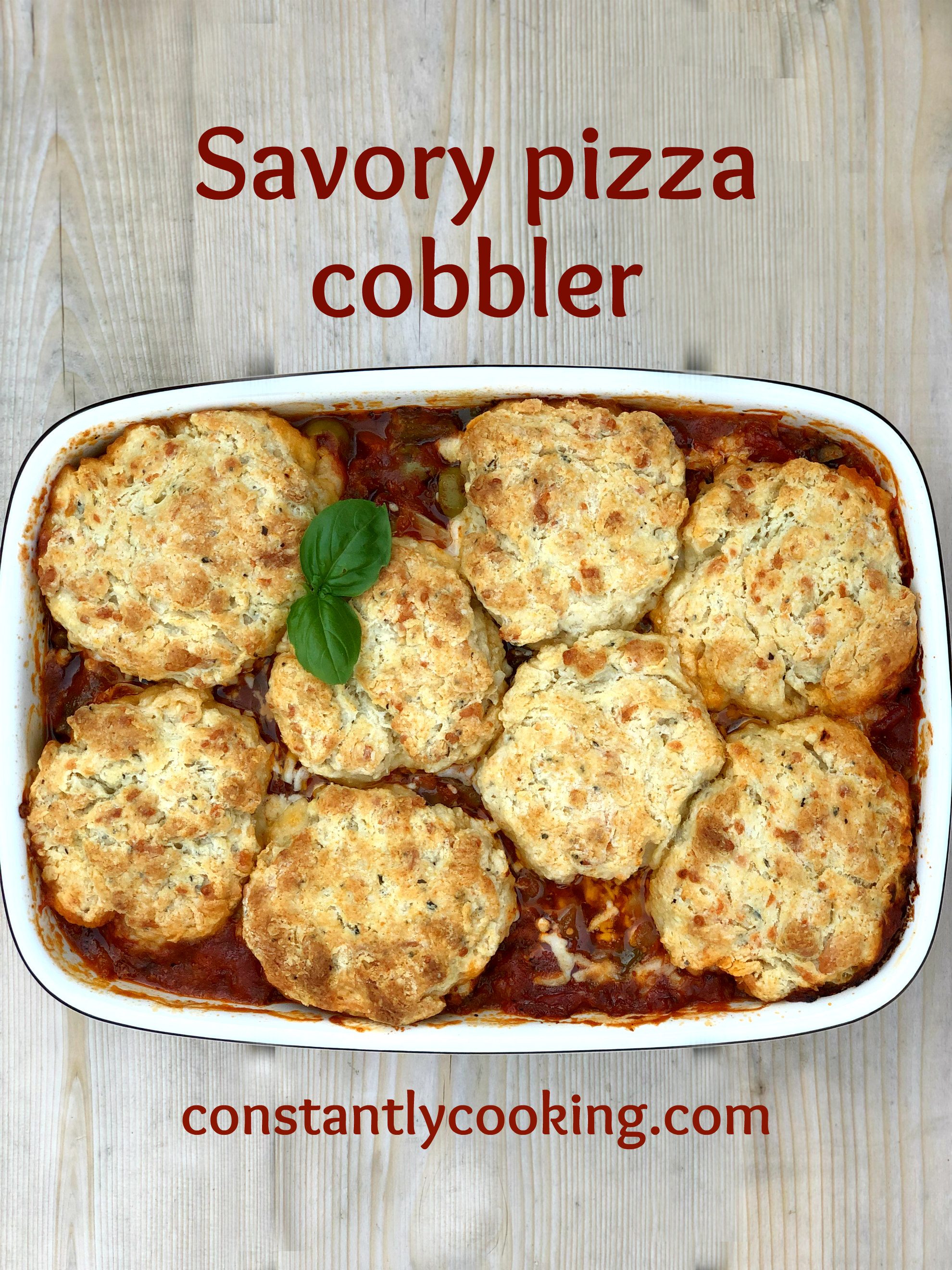 When someone mentions making or eating cobbler, what usually springs to mind is juicy, sweet fruit cooked with biscuit dough on top. But it occurred to me that there’s no reason why savory ingredients can’t get the same delicious treatment! Given my family’s unwavering love for pizza, I figured that would be a good initial experiment, and it proved to be a great success. Customize it with your favourite pizza toppings and make the biscuits with gluten-free flour if needed. Just like pizza, this dish is delicious hot but equally tasty at room temperature or straight out of the fridge. If this recipe appeals to you, you might also enjoy my pizza meatball casserole, pizza-stuffed portobello mushrooms or my pizza biscuits.