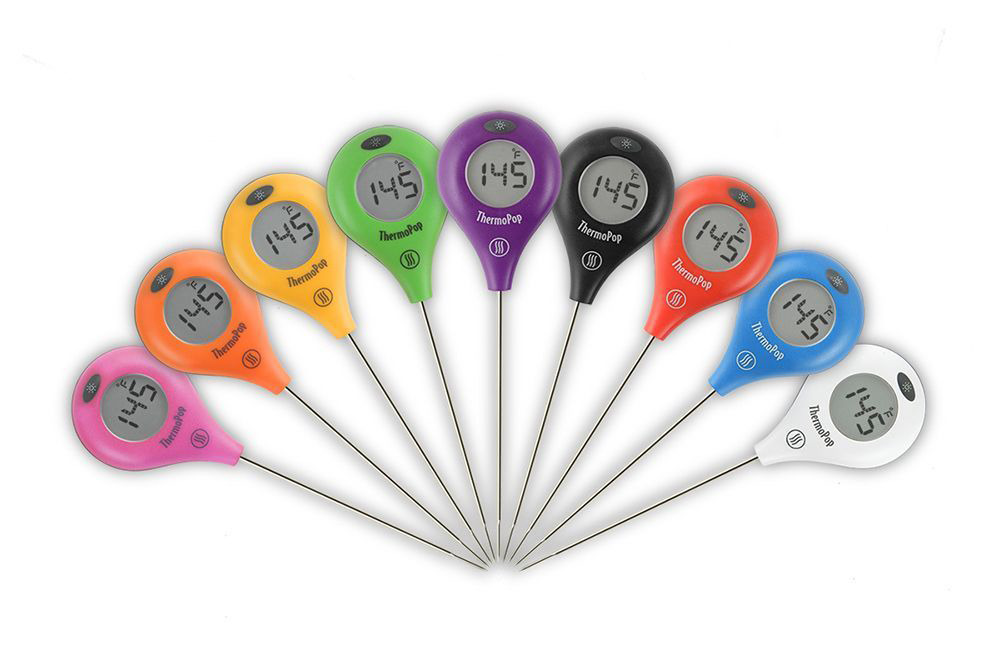 Food thermometers are important to ensure food is neither undercooked nor overcooked. One of the best value digital thermometers is the ThermoPop and it’s affordable, effective and easy to use. With a rotating display and big backlit digits, the splash-proof, very durable thermometer provides a superfast reading in your preferred unit of measurement (ranging from -58 to 572°F or -50 to 300°C). The included batteries offer about 5,000 hours of typical performance and the ThermoPop comes in a fun array of colours. Available at select kitchen supply stores or at http://www.thermoworks.com.