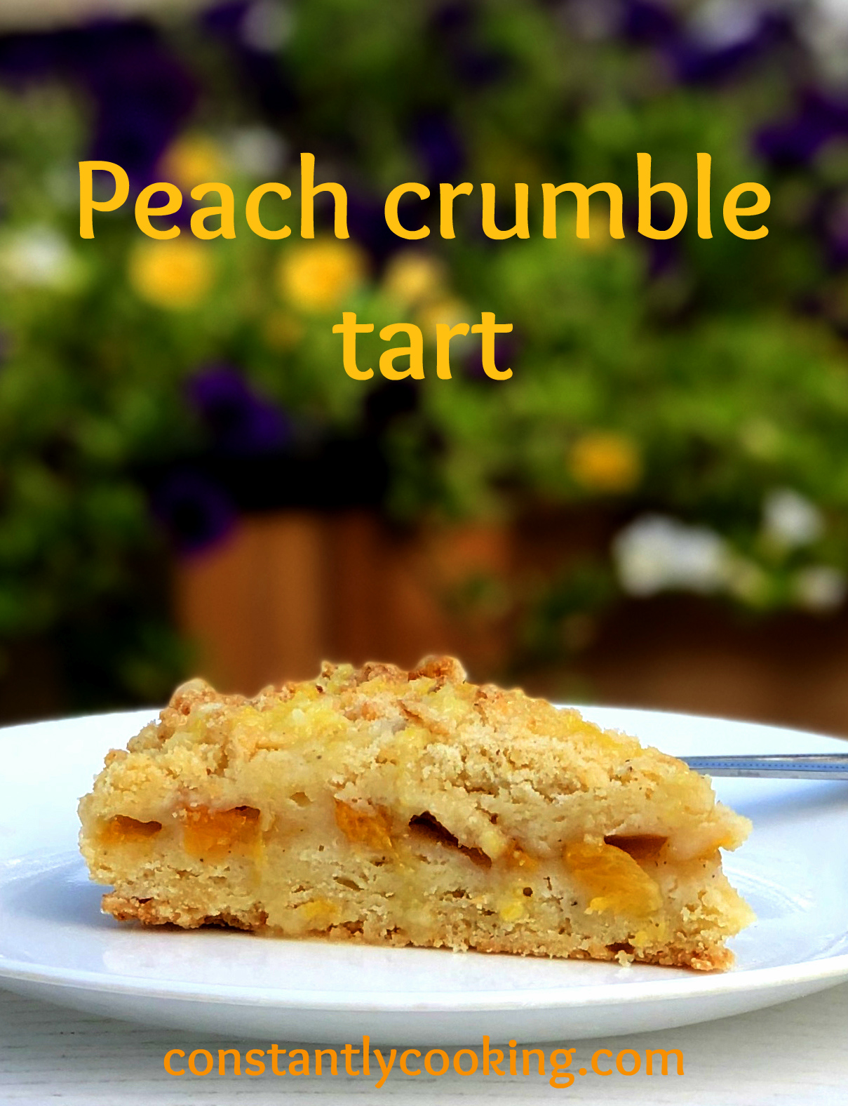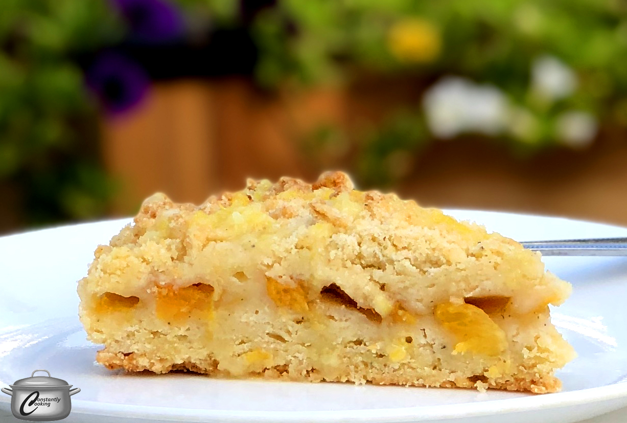 - Scatter the remainder of the crumble topping evenly over the peaches.