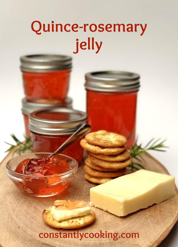 At first glance, you might be surprised – as I was – that odd looking quince – a fruit typically harvested in autumn in parts of North America – can be transformed into a delicious savory jelly. Popular for millennia in and around the Mediterranean, quince look like lumpy pears but have the texture of very hard apples. Though inedible when raw, cooked quinces yield fragrant and delicious juice with a pretty rosy-orange colour. I love the combination of rosemary and quince but you could also use fresh thyme if you prefer.