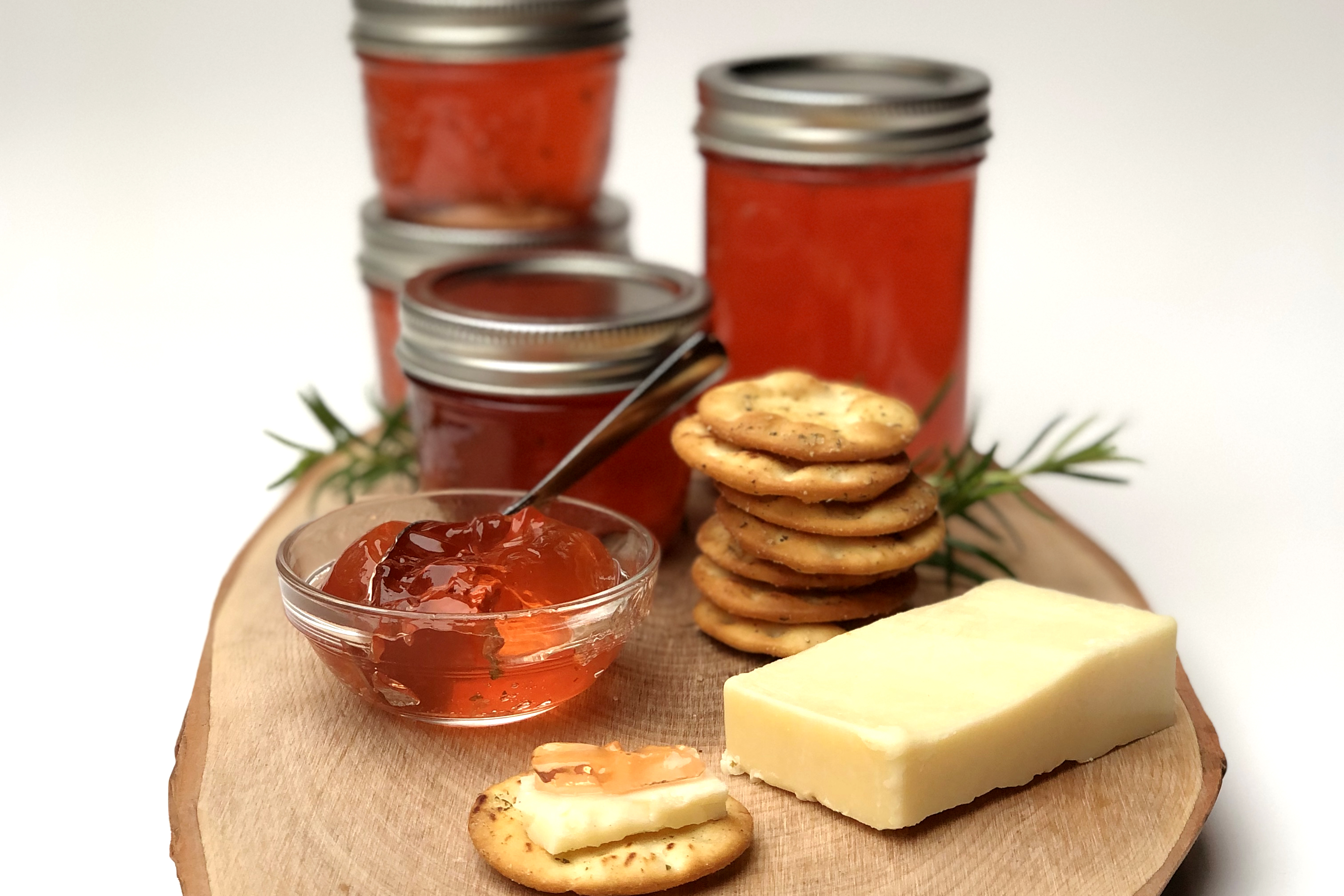 At first glance, you might be surprised – as I was – that odd looking quince – a fruit typically harvested in autumn in parts of North America – can be transformed into a delicious savory jelly. Popular for millennia in and around the Mediterranean, quince look like lumpy pears but have the texture of very hard apples. Though inedible when raw, cooked quinces yield fragrant and delicious juice with a pretty rosy-orange colour. I love the combination of rosemary and quince but you could also use fresh thyme if you prefer.