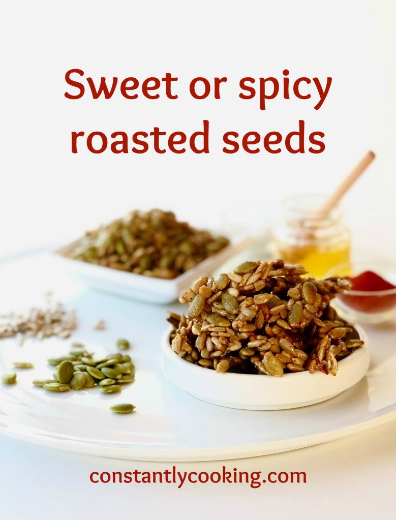 Health-conscious eaters have long embraced seeds, given that they are nutritional powerhouses and often favoured by those allergic to nuts. Rich in protein, fibre, unsaturated fats and omega fatty acids, seeds can be the perfect pick-me-up and if you buy raw ones to roast at home, they’re quite inexpensive as well. I like to use the sweet version (recipe below) as a topping for granola, porridge or yogurt; it’s also fantastic scattered on melted dark chocolate to make a crunchy bark. The savoury version provided here is superb on top of salads, soups, roasted vegetables, avocado toast and more. If you are a fan of sweet and spicy combos, I think you’ll find that a mashup of these two recipes is pretty awesome as well – in fact, it’s my new go-to hostess gift.