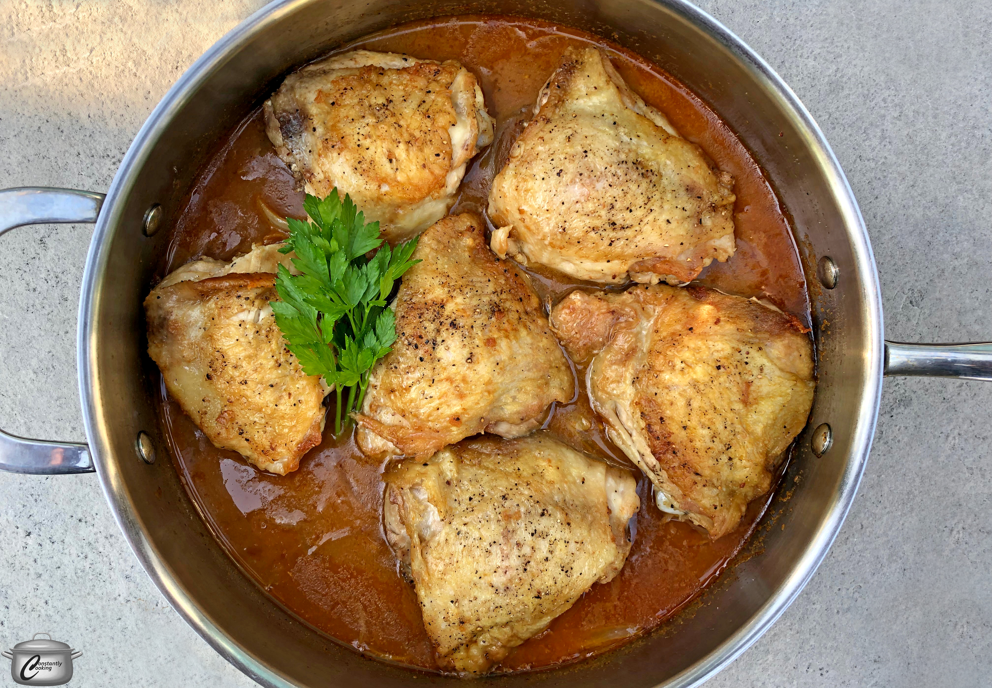 Normally, braising is a cooking process that takes hours to achieve tender, flavourful meat. In this dish, searing the meat over high heat at the beginning significantly reduces the time required to produce succulent chicken bathed in a rich, flavourful sauce. You can omit the apricots if you like, or swap in dried cranberries or sliced prunes if you prefer. I like to serve this easy meal over rice, pasta or mashed potatoes.