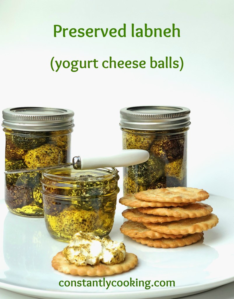I love Lebanese cuisine and these little preserved cheese balls made from yogurt have long been a favourite, though I never knew until recently how relatively easy they are to prepare. They’re often featured on breakfast or brunch menus but I also love them as a quick snack with crackers or pita bread. I like to use several different coloured spice blends including za’atar, lemon pepper, dried mint or barbeque rub but the sky’s the limit when it comes to the flavourings you use. Note that you can skip the step of rolling the yogurt cheese into balls if you prefer, and just use it as a cream cheese style spread thought it will not stay fresh as long as the preserved labneh balls in oil do.