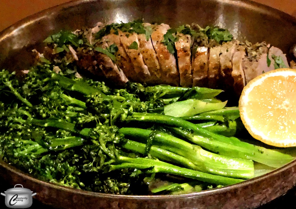 • While meat is resting, heat remaining oil over medium-high heat, in the same skillet used previously. Add the broccolini and stir fry for 3 minutes, turning often. Add the water and cover the pot to let the broccolini steam for 2 minutes. Test the stems with the tip of a sharp knife – they should be tender-crisp when done. Remove from heat and sprinkle with lemon juice plus salt and pepper.
