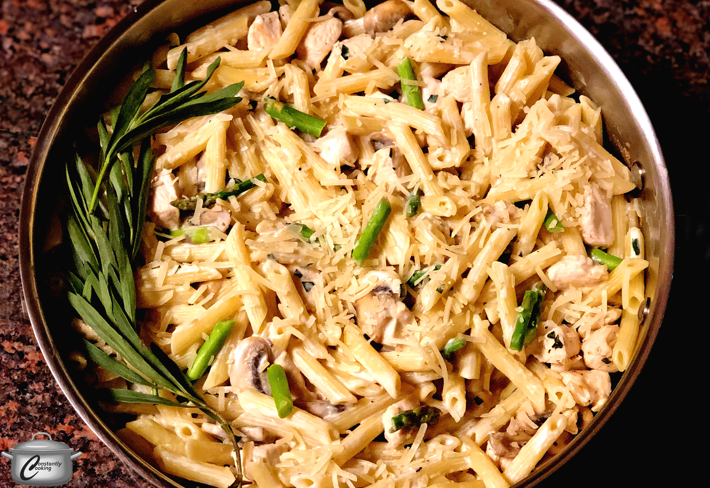 On busy nights, I’m a big fan of easy dishes that don’t require a lot of prep or cooking time, just like this tasty one. Total cooking time is less than 30 minutes and if you chop the chicken and vegetables ahead of time you will be able to just pull things out of the fridge and have dinner on the table with ease. Be sure to choose a skillet that is large enough to hold the chicken, vegetables and cooked pasta and, as I usually recommend, feel free to use gluten-free pasta and/or your favourite non-dairy cream and Parmesan-style cheese.  If you like a little citrusy zing, a squeeze of fresh lemon juice makes a nice extra finishing touch.