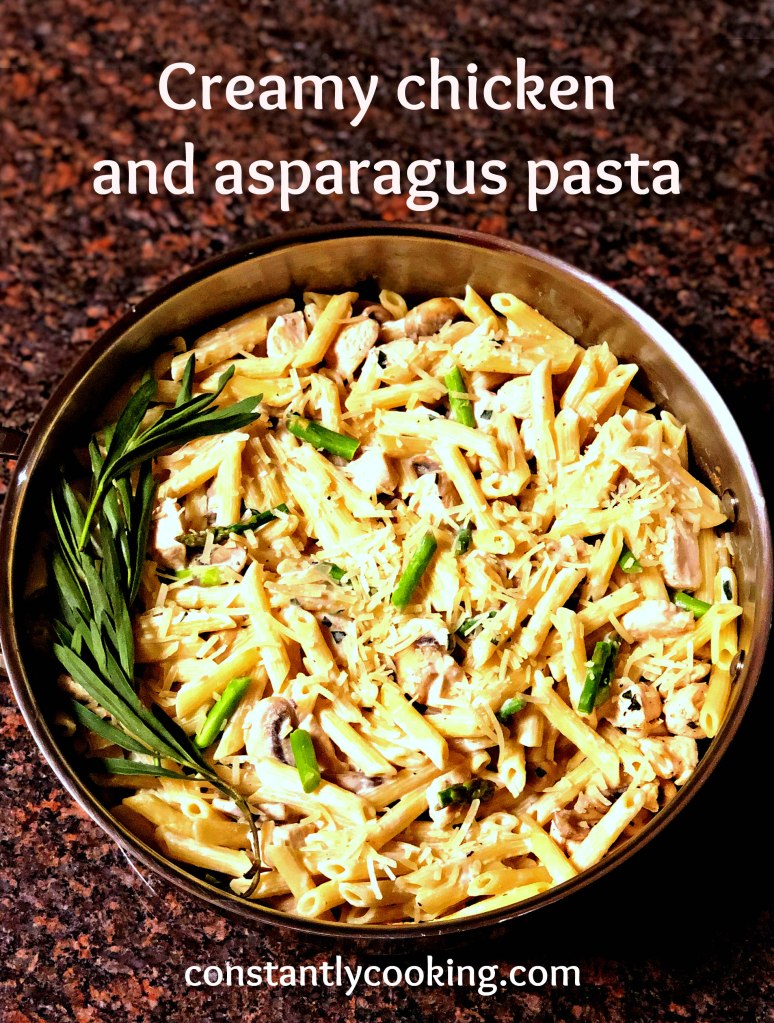 • While pasta cooks, trim the woody ends off the asparagus spears and cut them cut on diagonal into 1 inch (2.5 cm) pieces. Pour chicken broth into the skillet. Bring to a boil over medium-high heat, then add garlic and let cook for 1 minute. Add asparagus pieces then cover and turn off heat; let asparagus steam until just tender (check stems with the tip of a sharp knife), about 4 – 5 minutes. Return chicken mixture to the skillet and place over medium-low heat to re-warm.