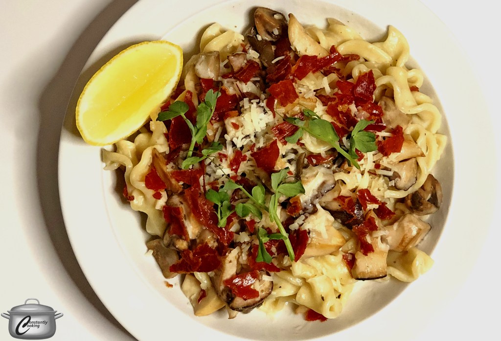 If I were naming this dish for a restaurant menu, I might call it ‘mushroom lovers’ pasta’ as it was inspired, in part, by a pizza by the same name which I recently enjoyed. I like wide pasta for this so the sauce can really sit on top; bowties would be another good alternative. If you like things spicy, a few pinches of hot pepper flakes would be a delightful addition to the sauce. Consider this a base upon which you can experiment – I may try adding slivers of sun dried tomatoes next time; roasted halved cherry tomatoes would also be great, I think. Be patient when reducing the sauce after adding chicken broth and wine – you will be rewarded with a much greater depth of flavour. Use gluten-free pasta if you prefer and replace the prosciutto with vegan ‘bacon’ bits for a vegetarian meal.