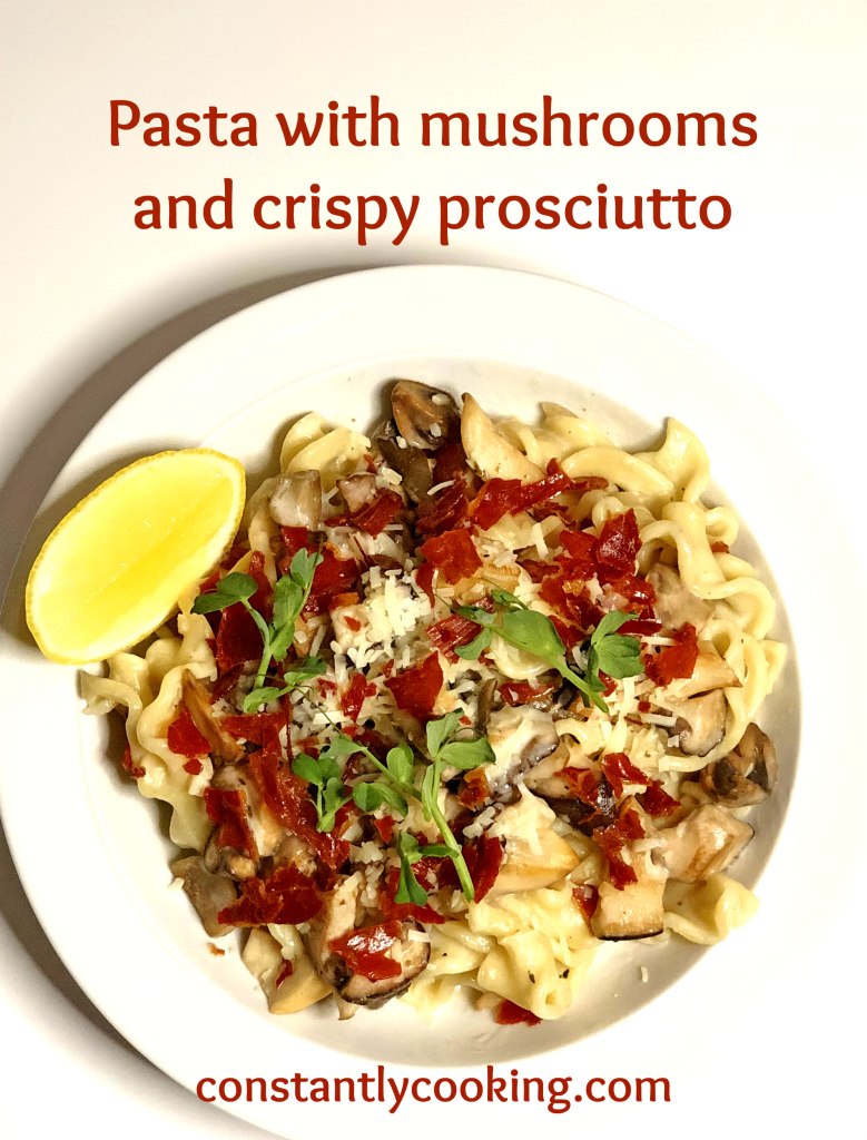 - Using tongs, a pronged pasta spoon or two forks, transfer cooked pasta to pot with mushrooms. Stir in reserved pasta cooking water along with the cooked mushrooms. Place over medium heat and bring to a simmer, and cook, tossing constantly, until liquid is slightly thickened, about 2 minutes. Add cream, return to a simmer, and cook, tossing, until pasta is coated, about 1 minute. Remove from heat; stir in half of the crispy prosciutto, and toss to combine. Taste and adjust seasonings if needed.