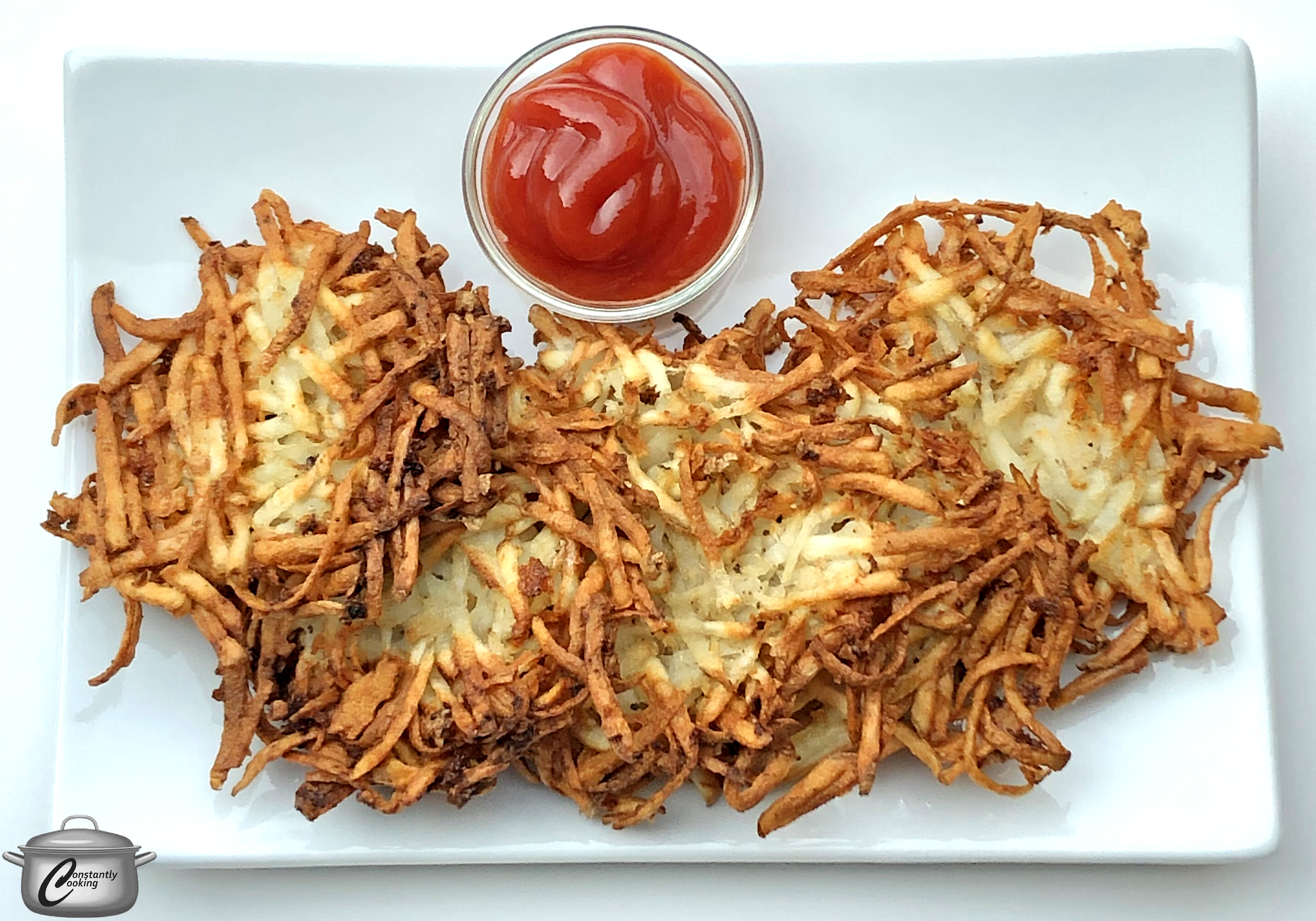 - Spray or brush the tops of the patties with oil; flip and spray or brush the other side. Carefully transfer them to the air fryer basket. Cook for 8 – 10 minutes, until golden brown on both sides (the centres will be less dark). If your air fryer does not have a crisping rack, you’ll need to flip the hash browns carefully after 5 minutes of cooking time.
