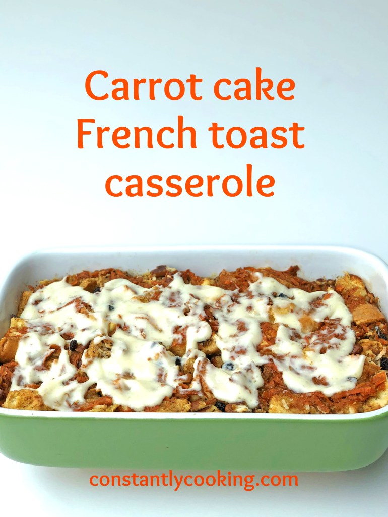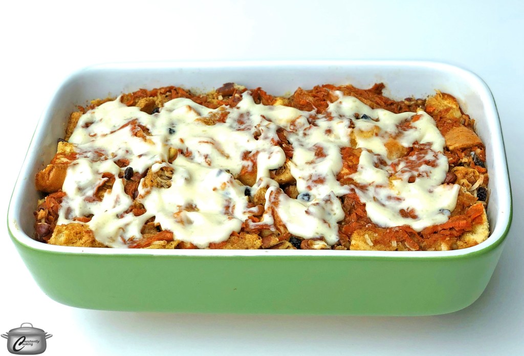 Similar to a bread pudding, this delightful dish can do double duty on a brunch menu or as a dessert. I used brioche-style bagels to make it and found the texture terrific; note that you could easily use your favourite gluten-free bread or bagels. It’s fabulous with the cream cheese glaze but you can skip that and drizzle with maple syrup if you prefer. For a savoury dish that’s similar in terms of preparation and texture, check out my bagel breakfast strata. And if you love the flavours of carrot cake as much as I do, you might want to make this carrot cake jam for your next cheese or charcuterie board, or serve up these festive carrot cake cookie sandwiches.