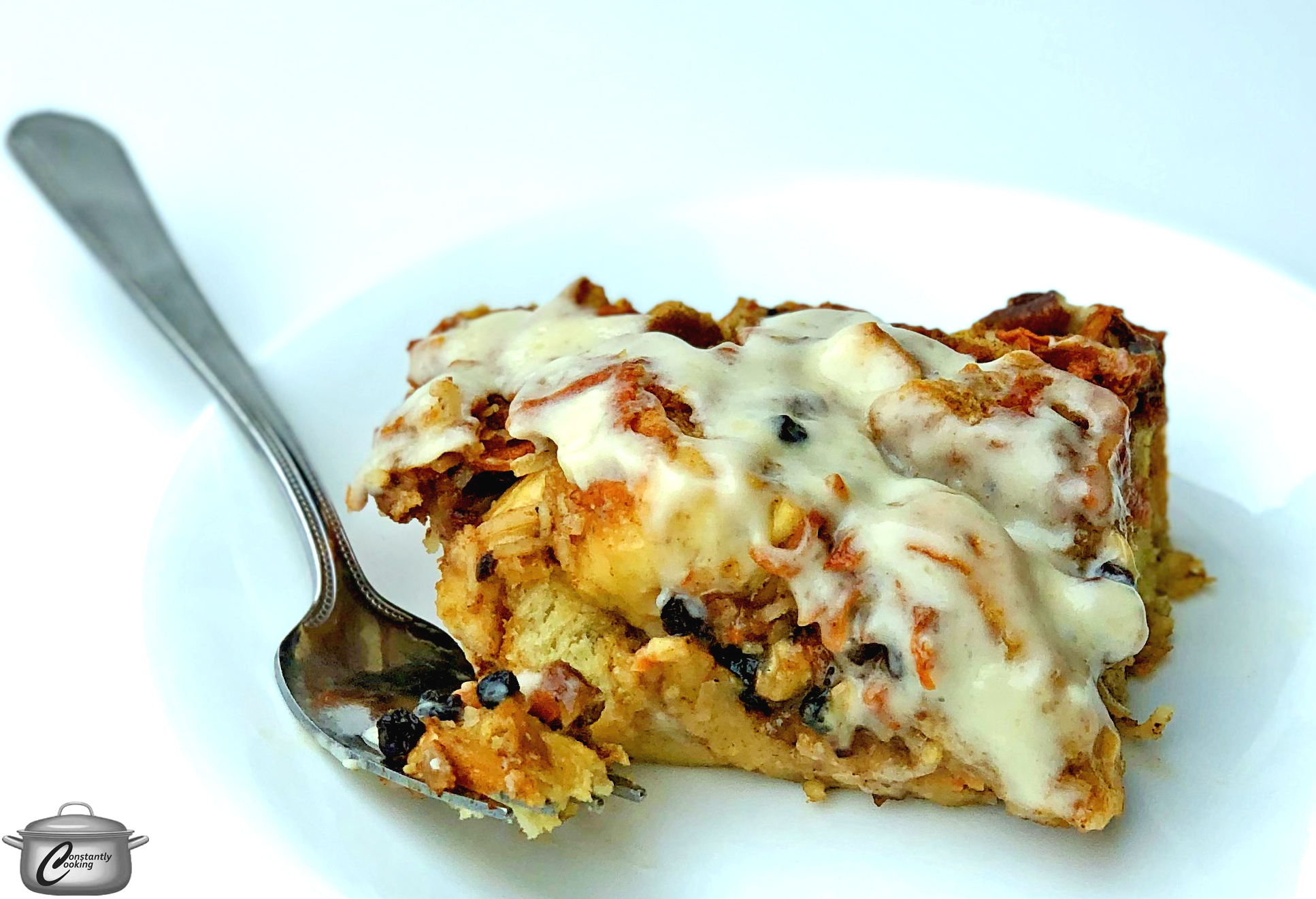 - Let casserole rest for 3 – 5 minutes after removing from oven, then drizzle glaze over top. Cut into squares and serve warm or at room temperature.