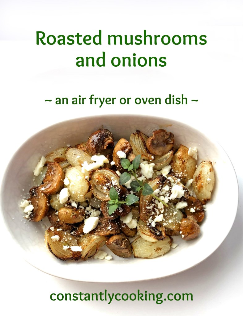 While I am presenting this to you as a great side dish for grilled or roasted meat or fish, to be perfectly honest, it’s also a great standalone meal for brunch or lunch too, that would surely please vegetarians or omnivores. About a dozen medium-sized mushrooms are needed and recipe could easily be doubled. Peeling pearl onions can be a finicky job, but it’s one made much easier if you blanch the onions in boiling water for about 30 seconds and then transfer them to a bowl of ice water and let sit for a minute or two. Pinch each onion at its stem end, and it should just slip out of its skin. Super simple to make in an air fryer, the mushrooms and onions can also be roasted in a 400F oven, but will take a little longer and should be stirred a few times during cooking.