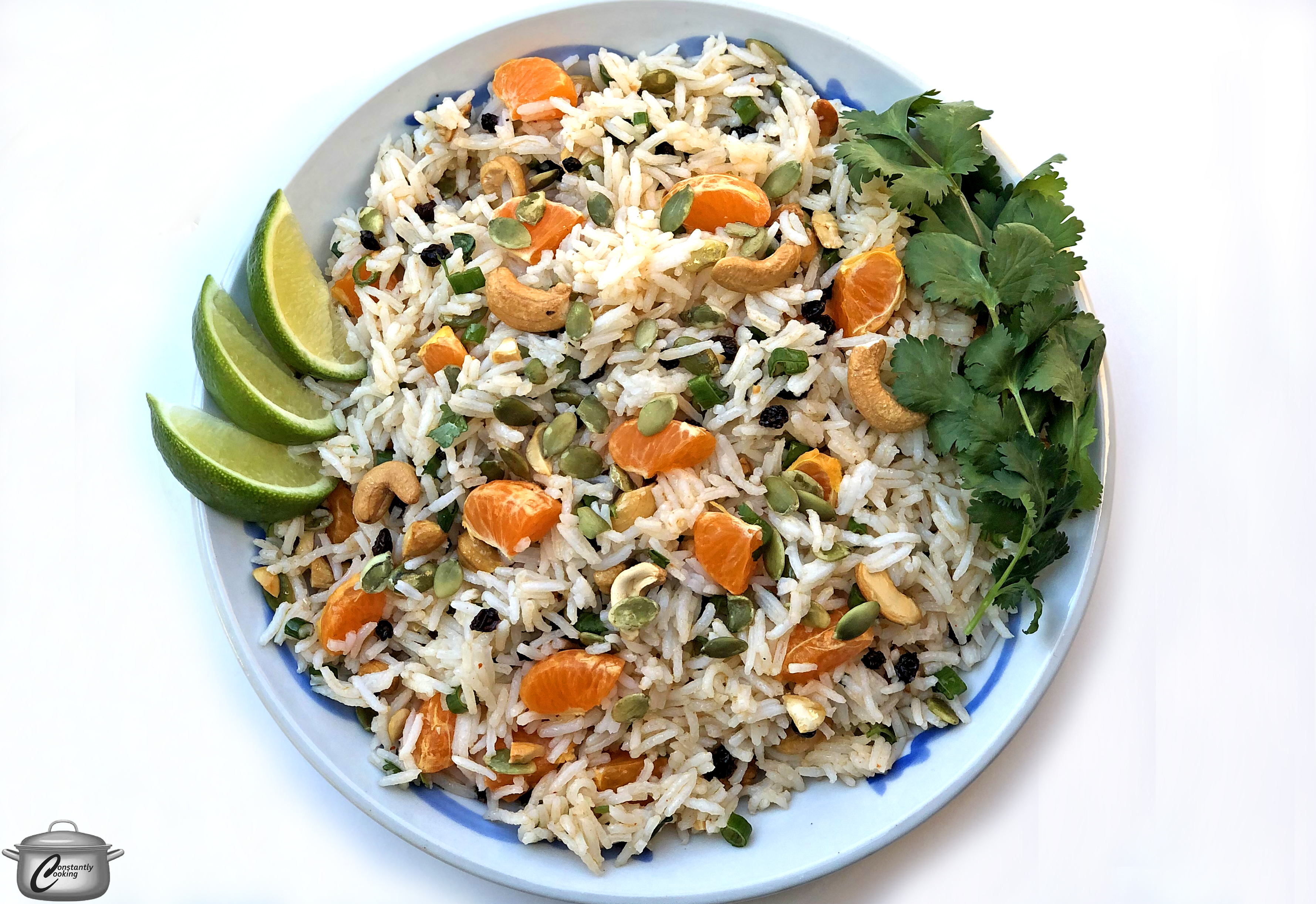 - When rice has cooled, add the clementines, pepitas, cashews, currants, cilantro and green onions to the bowl. Toss gently to combine.