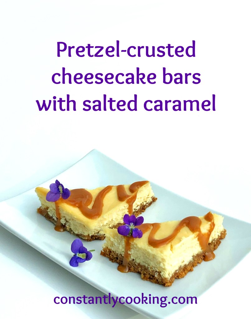 I love classic cheesecake but the other day I wanted to see if I could speed up the process for a short-notice dinner party. This recipe is the result and I know I’ll be making it often. There’s lots to like about this dish: you don’t need a springform pan, it cooks more quickly and you can use readily-available gluten-free pretzels for the crust, if you prefer. We love salted caramel sauce on lots of different desserts but these bars would be equally delicious with a drizzle of melted chocolate and a few sliced, fresh berries. If you’re a cheesecake fan, you might also enjoy these cherry cheesecake popsicles.