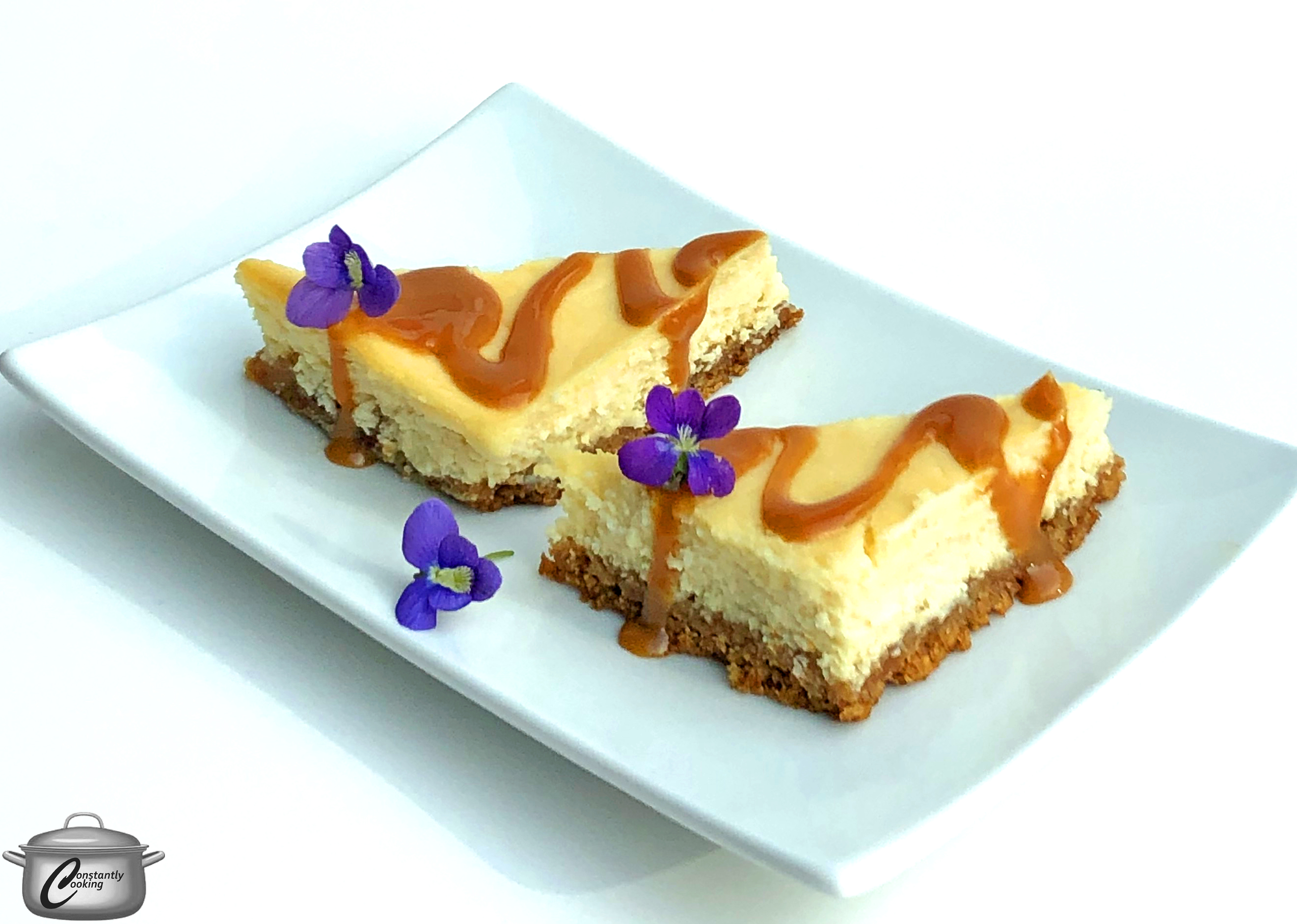 - To serve, cut cheesecake into rectangles or triangles and place on serving plates. Drizzle with caramel sauce.