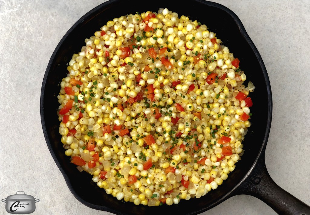 - Add the corn, red pepper, salt and pepper. Cook until the corn is tender, 5 to 7 minutes for fresh or 8 minutes for frozen. Stir in cream and let cook for 2 minutes then transfer to a serving dish. Sprinkle with chives and serve hot, with lime wedges on the side.
