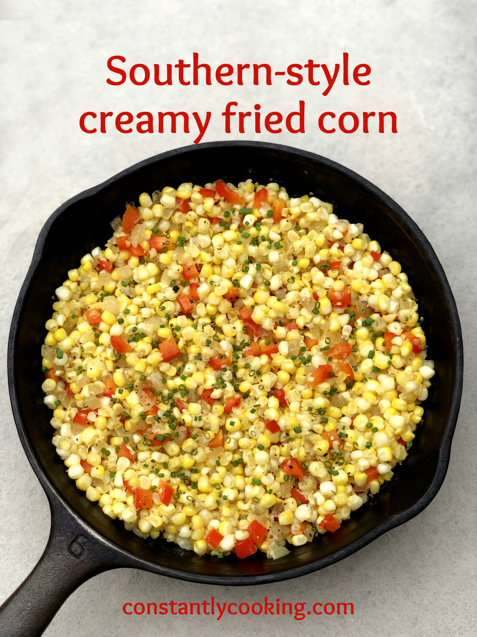 - Add the corn, red pepper, salt and pepper. Cook until the corn is tender, 5 to 7 minutes for fresh or 8 minutes for frozen. Stir in cream and let cook for 2 minutes then transfer to a serving dish. Sprinkle with chives and serve hot, with lime wedges on the side.