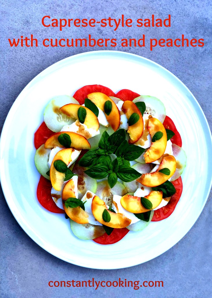 I have always loved Caprese salad – to me, the combination of sliced fresh mozzarella and tomatoes, garnished with basil leaves and dressed with a little salt, pepper and olive oil (and sometimes balsamic) showcases the best of each ingredient so perfectly. I recently decided to add in some sliced cucumbers and peaches and I may never make a Caprese any other way now. Note that the ingredients can be sliced and plated up to 6 hours ahead, but it’s best to drizzle the dressing on and sprinkle with salt and pepper right before serving. If you can find it, buffala (buffalo milk mozzarella) is really lovely in this dish and if you’re a big cheese fan, feel free to double the amount indicated below.