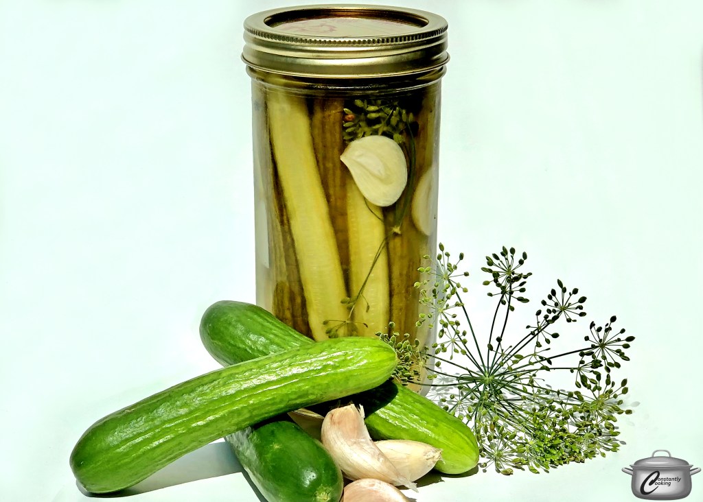 - Transfer the pickles and enough brine to cover completely into a canning jar that has the dill head in it (or other airtight container) and refrigerate. I found it easiest to do this by removing the cooled spears and placing them on a plate. I laid the canning jar on its side and packed the spears and garlic in around the dill, then covered with brine.
