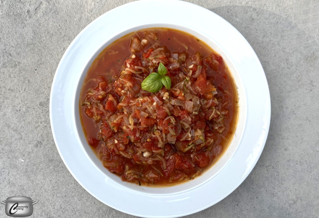 - If you like a more uniform texture, use a potato masher to break up some of the tomato pieces.