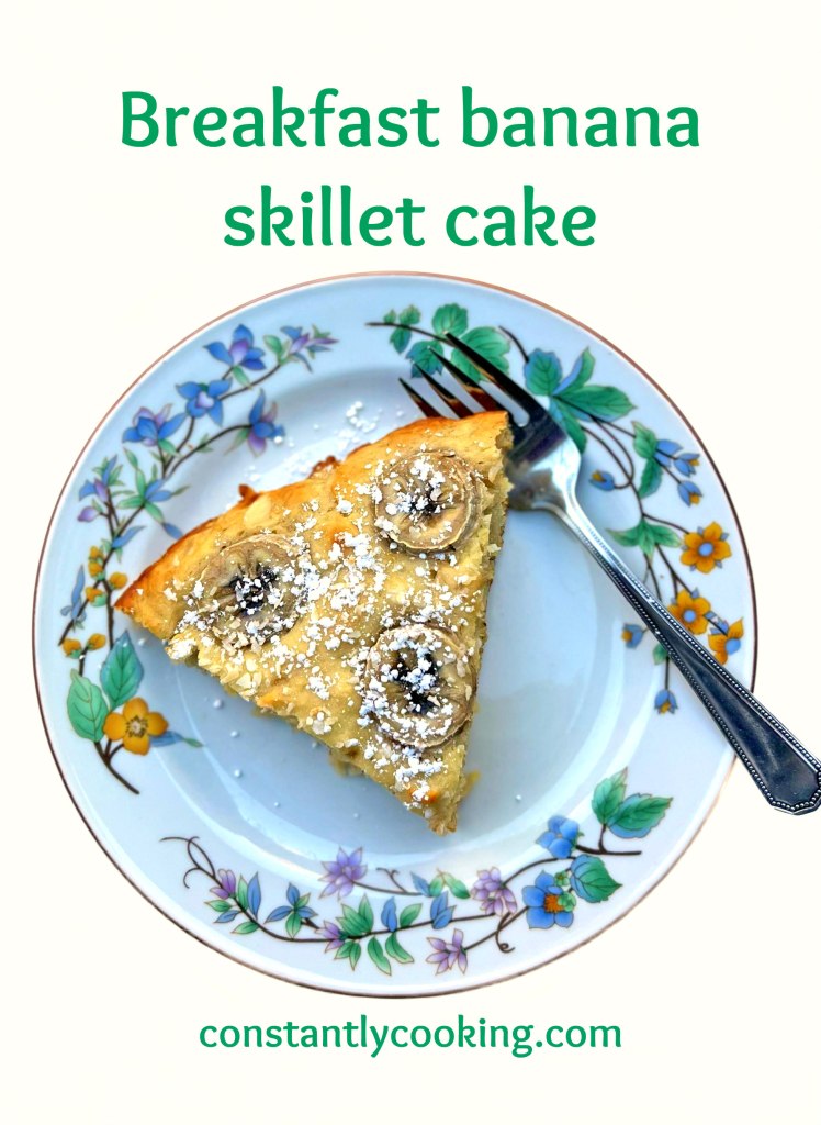 - Transfer the batter into the prepared skillet. Thinly slice the remaining banana and arrange in a single layer on top of the cake. Sprinkle with coconut.