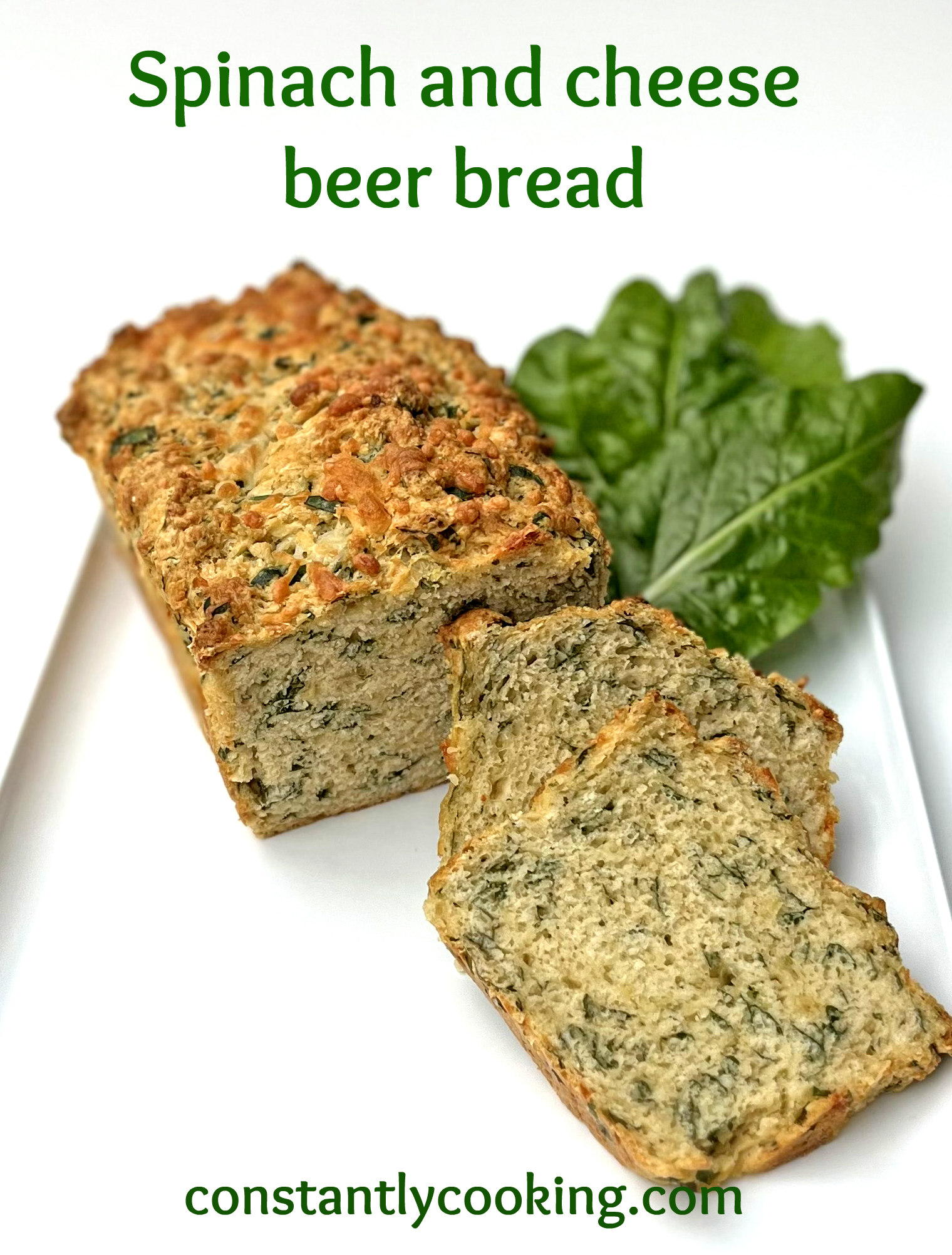 We love this bread with a simple salad for lunch; slices are great as-is or toasted and spread with a little butter or cream cheese. And yesterday I discovered that grilled cheese sandwiches made with this bread are outstanding; so are croutons. Choose a style of beer that you like, knowing the more intense the flavour, the more you will taste it in the bread. You can also use a mixture of 1 1/3 cups (325 mL) of water mixed with 2 tablespoons (30 mL) of cider vinegar instead of the beer, if you prefer. Use your favourite non-dairy butter and cheese for a vegan version if you like. Note the very specific pan size given below; it is the best size (learn more via this helpful chart) for this volume of dough, to get a nicely-proportioned loaf. If you’re a fan of quick, savory loaves like this, you might also enjoy my upside-down Italian pan bread.
