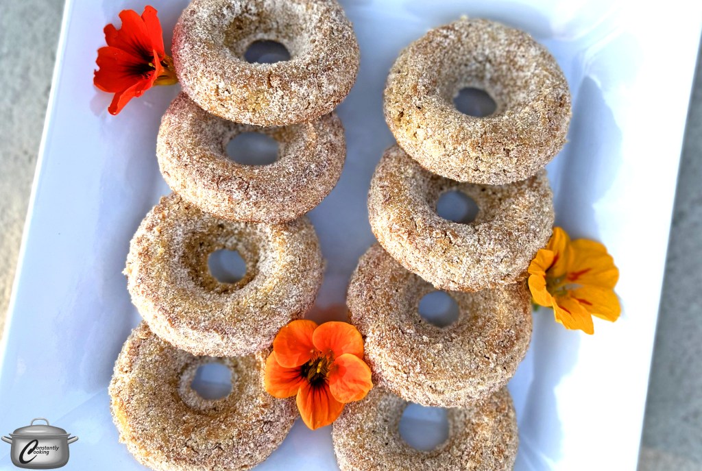 - While the doughnuts bake, make the topping by combining the granulated sugar, cinnamon and cardamom in a small bowl broad enough to dip the doughnuts in. Let the doughnuts cool for 5 minutes after baking, then carefully remove them from the pan(s) – I find a plastic takeout fork is great for loosening/removing them. While the doughnuts are still warm, dip both sides into the cinnamon-sugar mixture.
