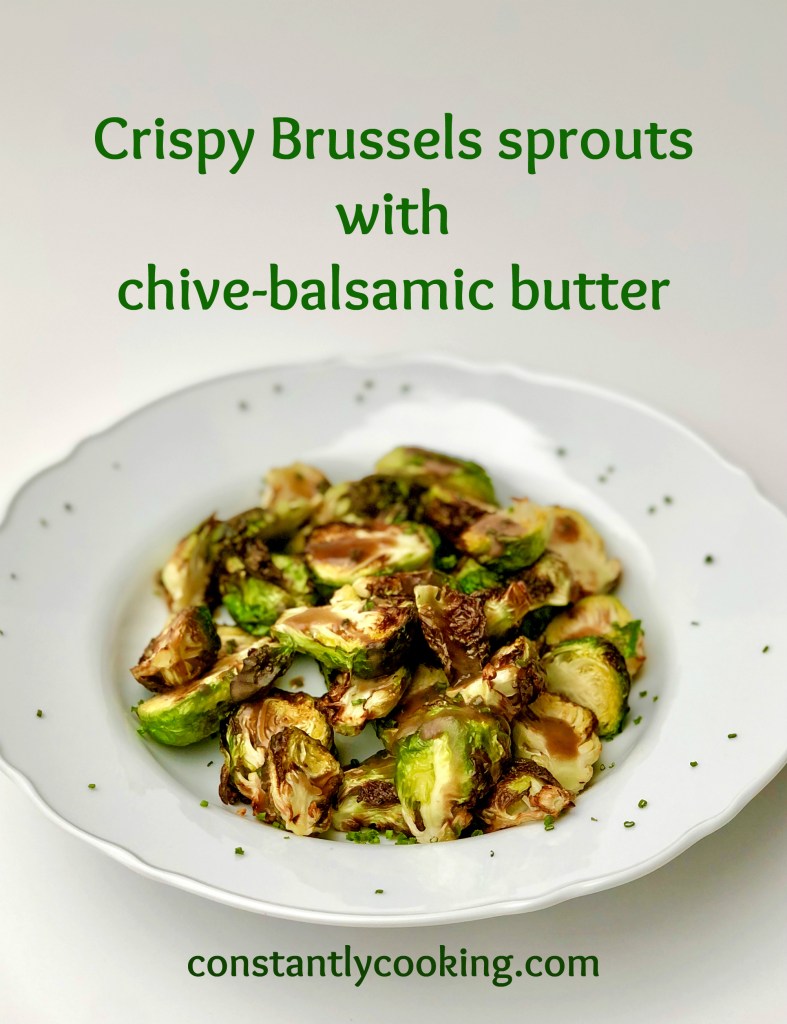 - When sprouts are cooked, transfer to a serving bowl. Drizzle with chive-balsamic butter and toss to coat evenly, then serve hot.