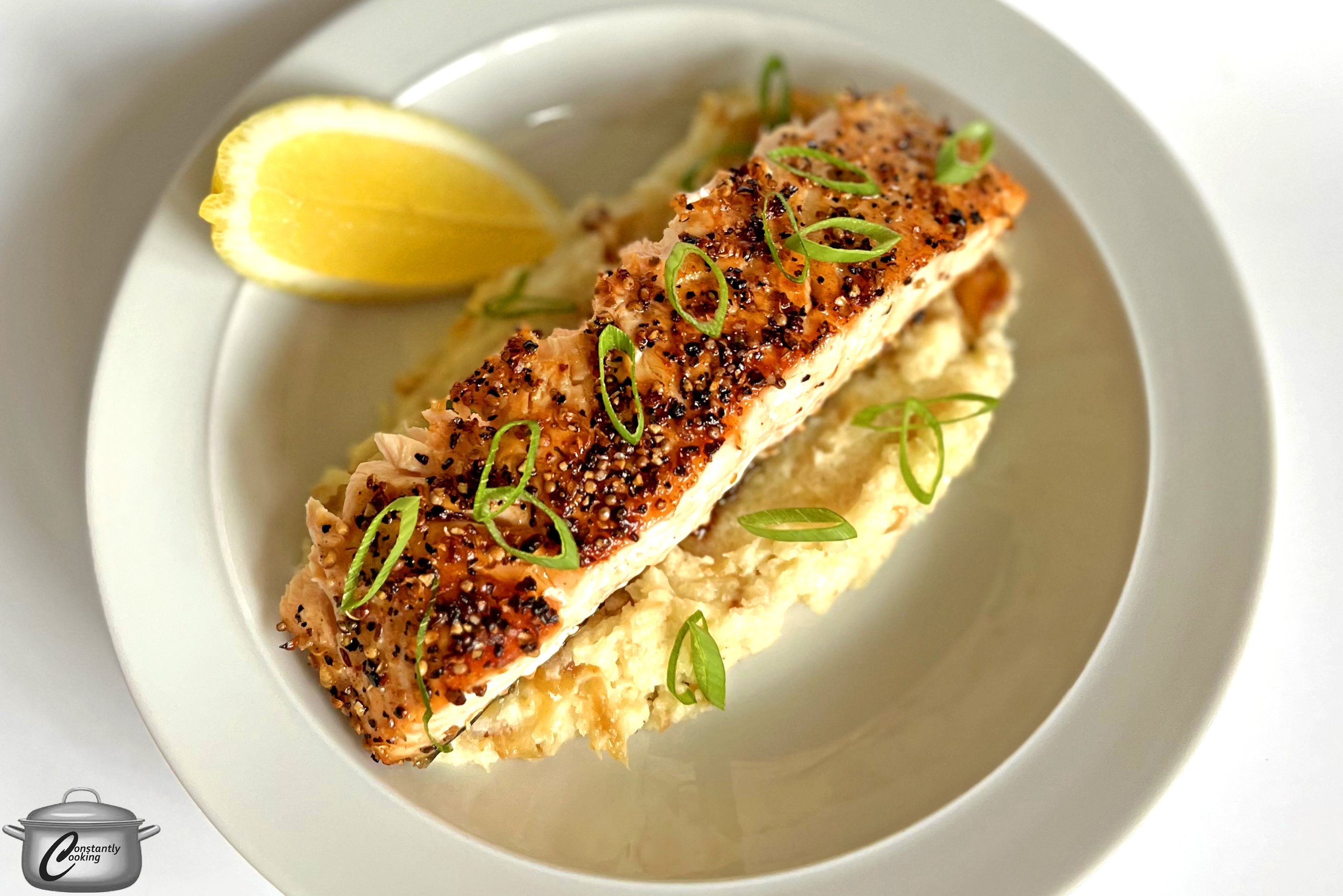 My family has always been big on eating fish at least once per week but recently we’ve been enjoying it more frequently as we love how nutritious and easy to prepare fish can be. One of the methods that I’ve really embraced for salmon is pan searing on medium-high heat; this gives it a deliciously crispy crust while also leaving the flesh tender and juicy. I find the best way to ensure you don’t overcook fish of any sort is to use an instant-read thermometer. Fish is fully cooked at 145F so I usually remove it from heat at about 140F and let it finish coming up to temperature while it rests for a minute or two. Note that I have included instructions below for air frying salmon fillets – as long as you keep an eye on them and check temperature often after the first eight minutes, this method yields fantastic results and I use it often. Look for salmon fillets that are of a reasonably uniform thickness, or consider trimming off any especially thin sides for even cooking. I like to serve this seared salmon on top of a potato-cauliflower mash and one of my favourite wine varietals to enjoy with fish is Viognier. I especially like the Elisabeth Viognier from Domaine de la Baume in France; it has a strong stone fruit aroma plus a flavour that is reminiscent of tangerines and we find it balances with the richness of the salmon just beautifully. If you’re looking for another easy and delicious way to prepare fish, check out my oven roasted salmon and vegetables recipe.