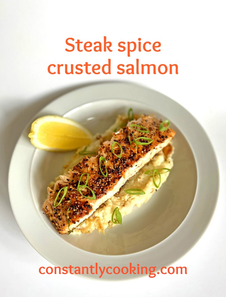 • Take salmon fillets out of the refrigerator 30 minutes before cooking. When ready to start, pat fillets dry with a paper towel and place on a clean plate. Drizzle both sides of each fillet with a bit of the oil and rub it in with your (very clean) hands. Sprinkle steak spice blend evenly over the top side of each fillet.