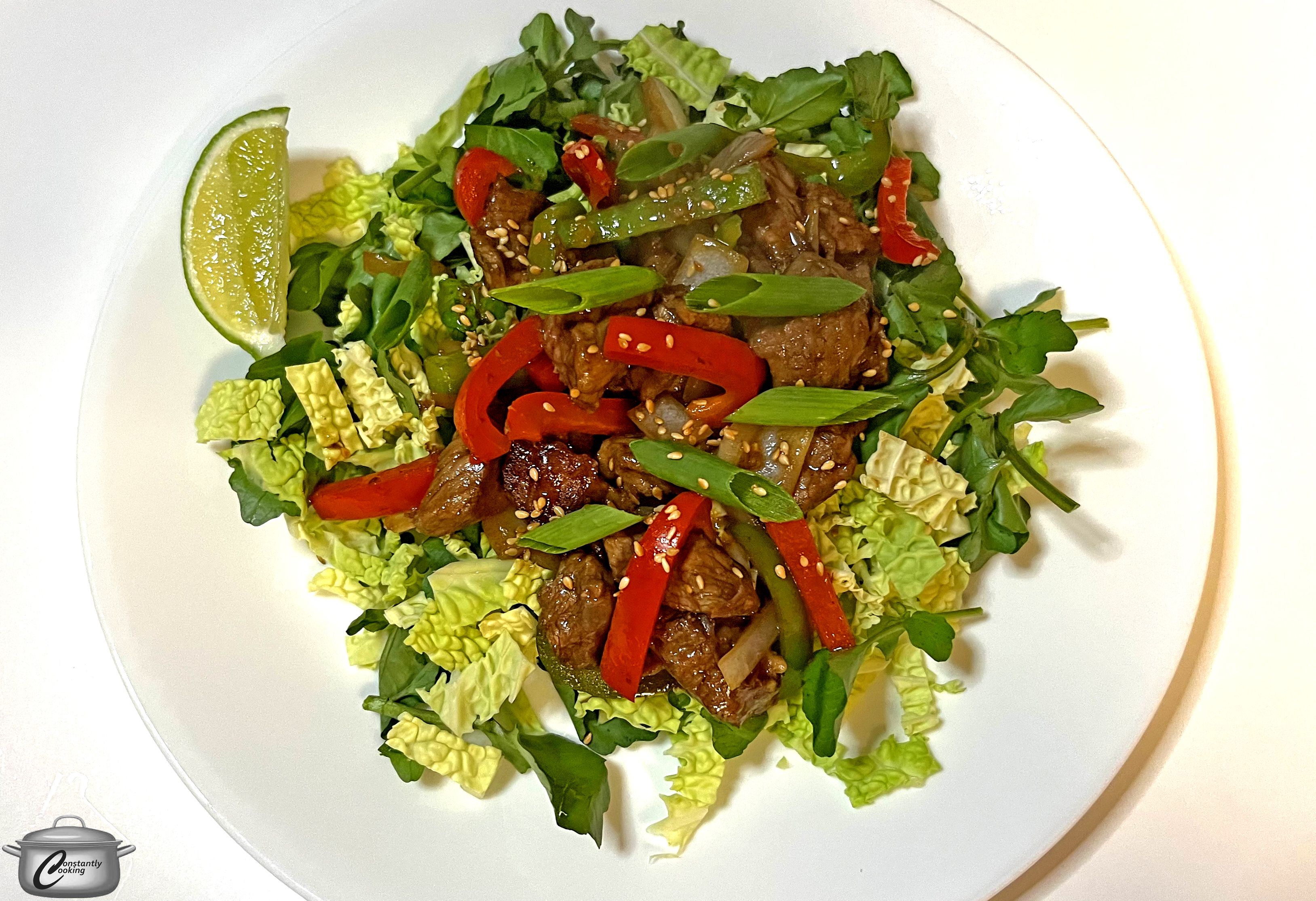 • To serve, divide the greens among two serving plates. Top with beef and vegetables, spooning pan juices over top. Sprinkle with combined salt and pepper, to taste, and squeeze lime juice over top. Scatter with sesame seeds and serve hot.